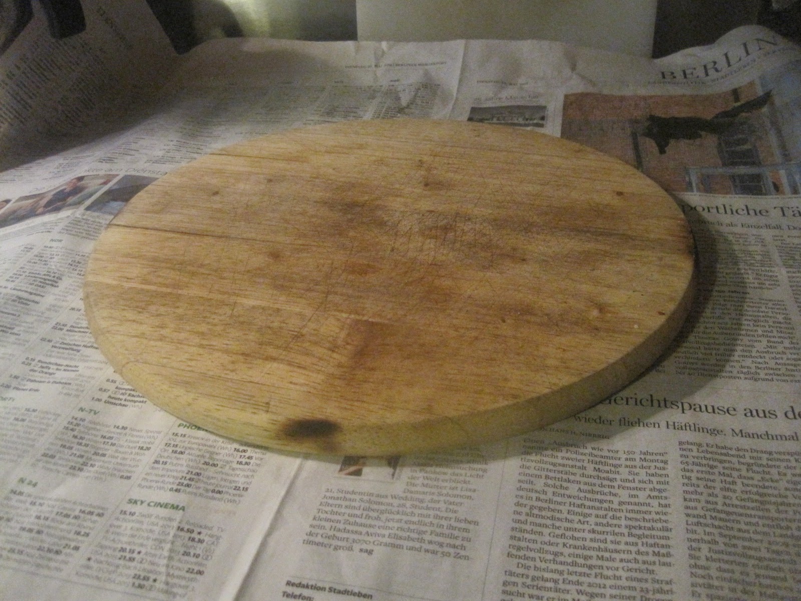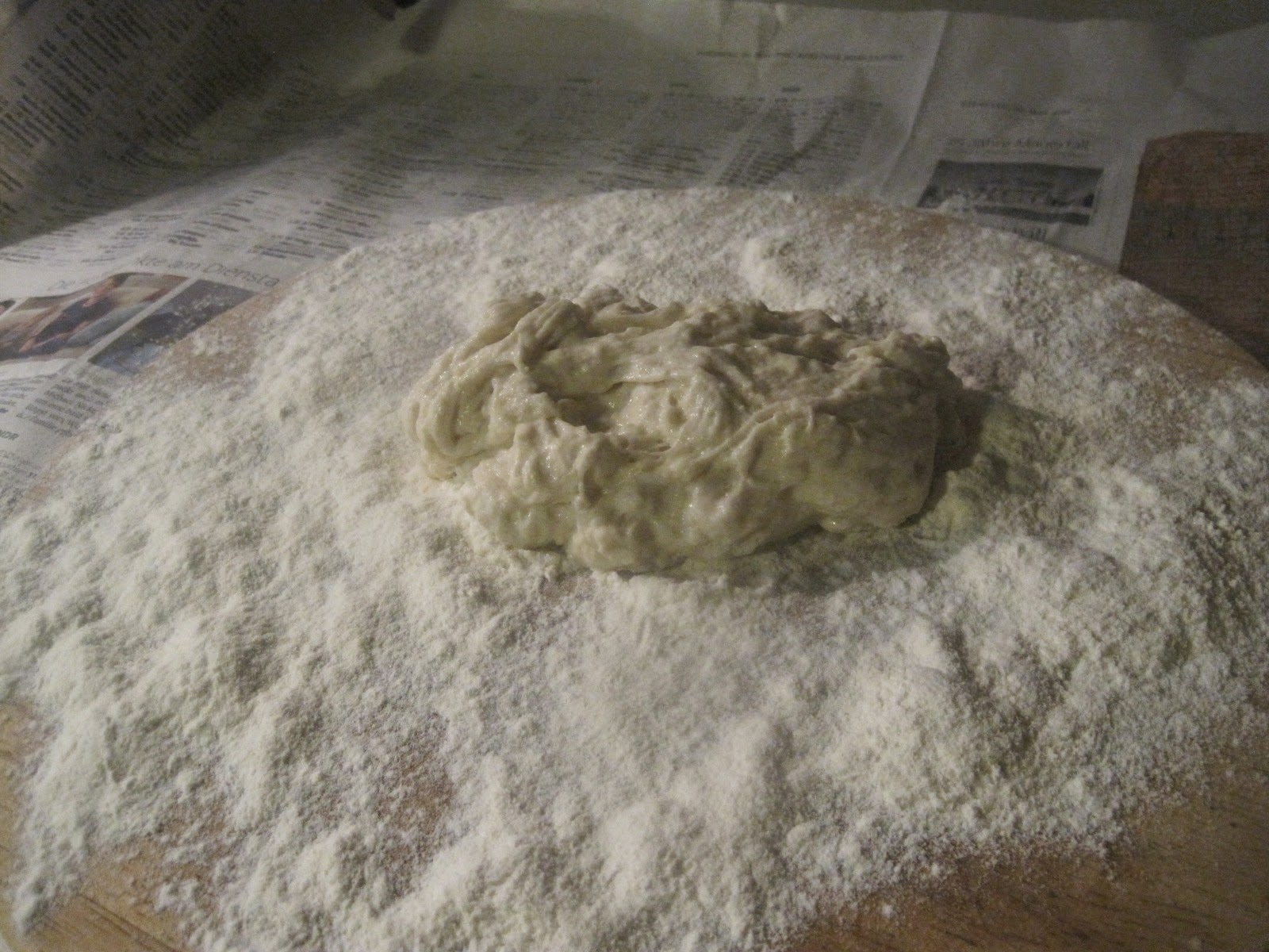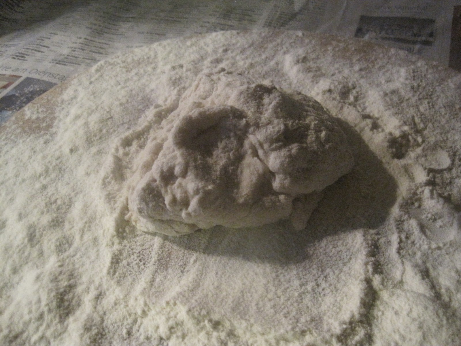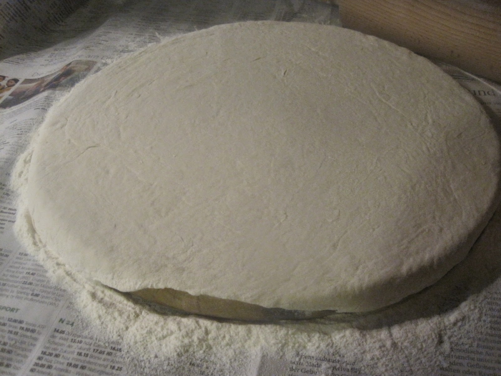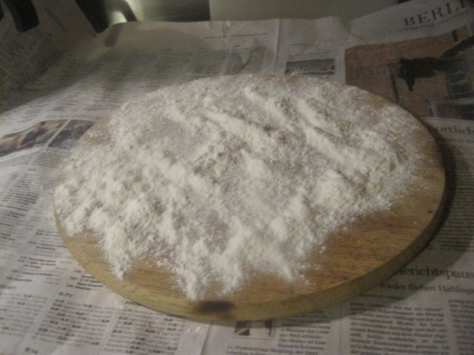 Bevor sich jetzt jemand fragt, was soll ich mit so einem klatschnassen Hefeteig im Kühlschrank, wie geht es weiter, hier noch, ohne auf die eigentlichen Pízzarezepte einzugehen, den weiteren Verarbeitungsvorgang im kurzen Abriss. Arbeitsfläche großflächig mit Zeitung auslegen, dann hat man beim Saubermachen später nicht soviel zu tun. Ich verwende runde Pizzableche, deswegen rolle ich den Teig auf einem Runden Holzbrett aus