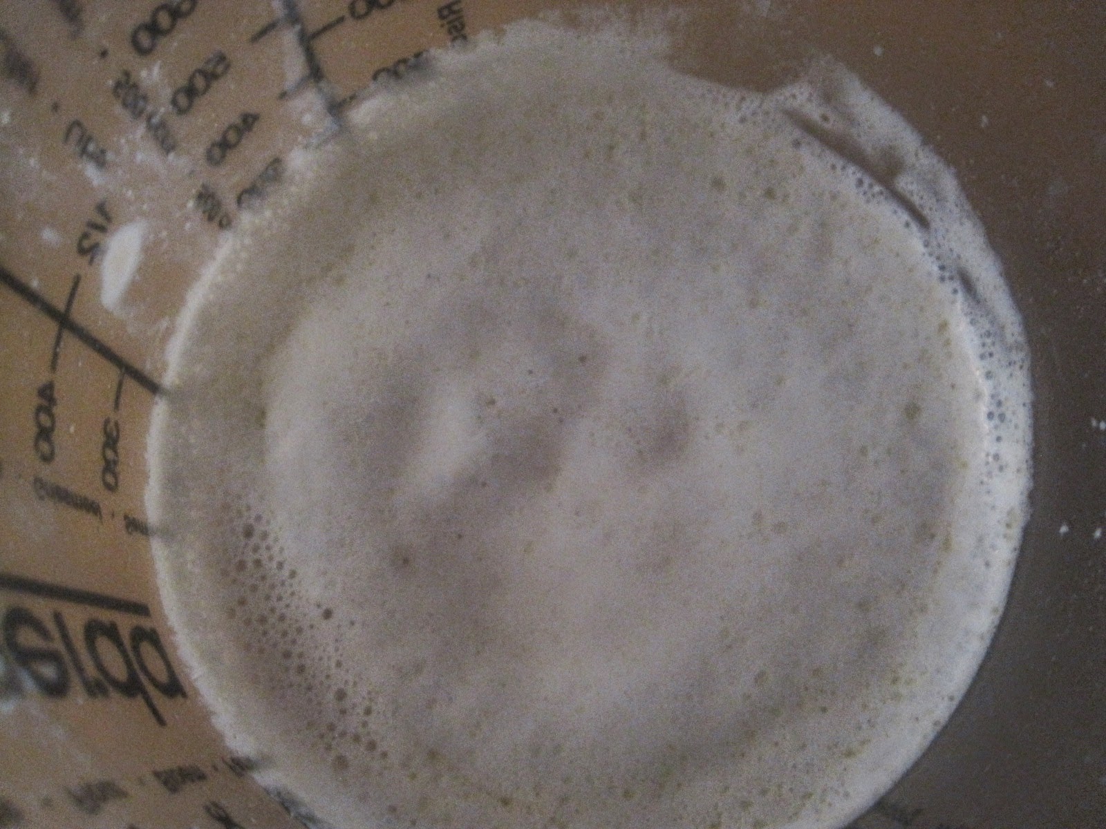 In der Zwischenzeit wird die Hefe aufgelöst. Nicht schüchtern sein, und rein mit dem Würfel. Wer meint solche Angaben wie 12 gramm beim Kochen verwenden zu müssen, sollte lieber Chemie studieren. Wie immer gilt beim Glatzkoch, viel kann viel, soll ja auch aufgehen, das Zeug. Das Wasser darf nicht wärmer als 40 Grad sein, also so, dass es warm ist, aber nicht weh tut, wenn man mit den Händen rein fassen würde. Hefe hat leider die dumme Angewohnheit bei mehr als 40 Grad abzusterben. Deswegen da bitte ein wenig vorsichtig sein. Aus diesem Grund, nehme ich auch das noch wärmere Wasser beim Teig, weil das ja bis die Hefe gut ist, schon kälter geworden ist, aber jedes Grad, das uns kurz vor die maximalen 40 Grad bringt, läßt den Teig besser aufgehen. Dann gibt es da noch etwas, das die Hefe zum Arbeiten bewegt, also gleich noch eine Prise Zucker einstreuen, weil das wie ein Turbo wirkt. Hefe soll mindestens 10 Minuten gehen, je länger je schöner. Haltet mal Euer Ohr an die Hefe, dann könnt ihr die Kohlensäure hören, die dort gebildet wird. Ohne Haare am Kopf fallen auch keine ins Gefäß. Eins zu null für den Glatzkoch!