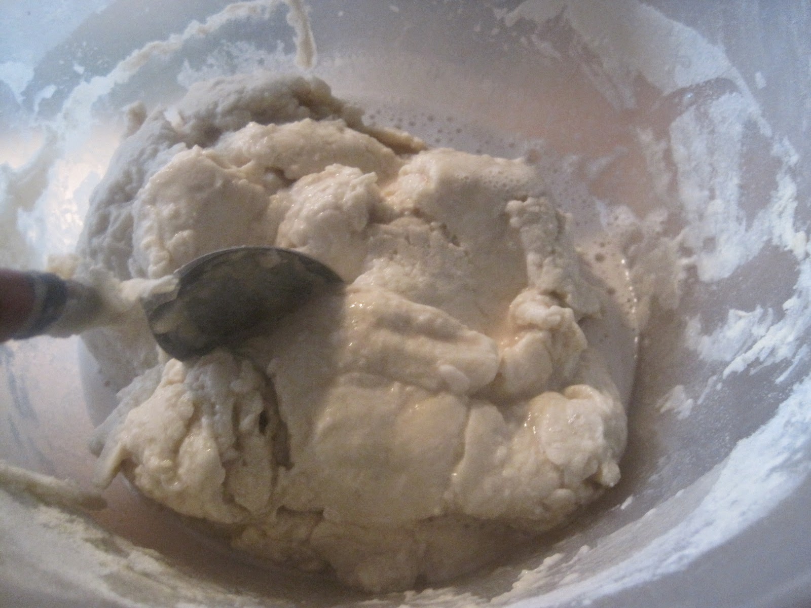 Mit einem Esslöffel, oder Kochlöffel, je nachdem was ihr zum Teigrühren genommen habt, einen Teigklecks auf das Arbeitsbrett geben und anfangen den Teig im Mehl zu wälzen, bis ihr merkt, dass der Teig von aussen nicht mehr klebrig ist.
