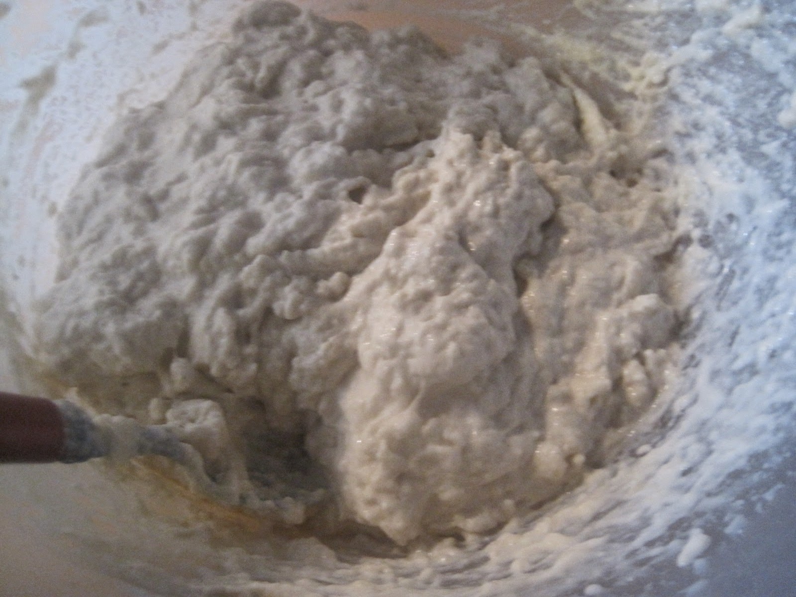 Anschließend die aufgelöste Hefe zum Teig geben. Nach den üblichen Hefeteigregeln, ist das natürlich viel zu feucht, ABER jetzt könnt Ihr das weiter mit dem Löffel rühren, braucht keine Maschine und macht Euch die Hände nicht beim Kneten schmutzig. Also immer weiter rühren, bis eine homogene breiige Masse entsteht.