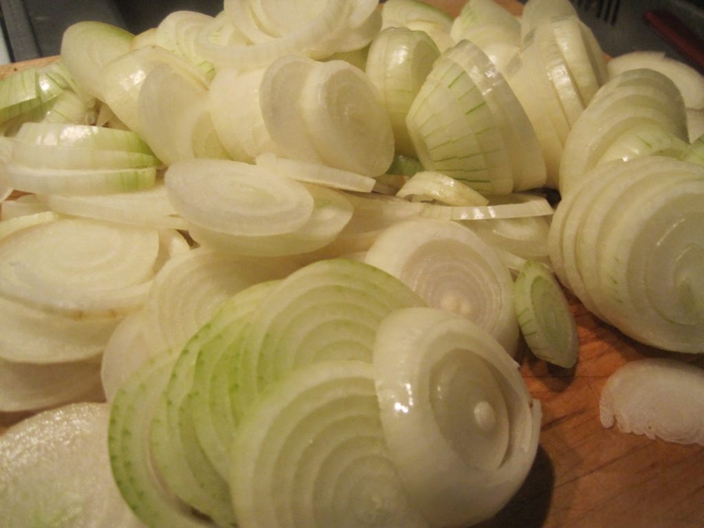 Die enthäuteten Zwiebeln in Ringe schneiden
