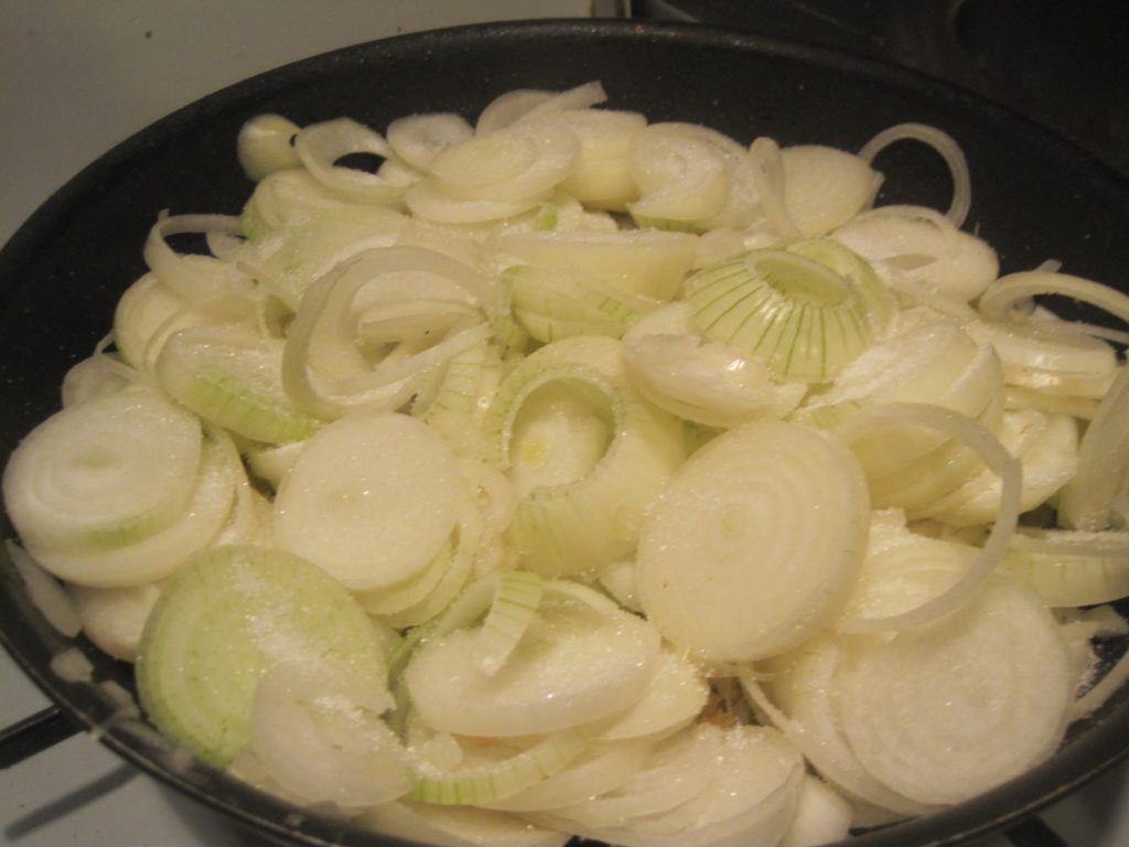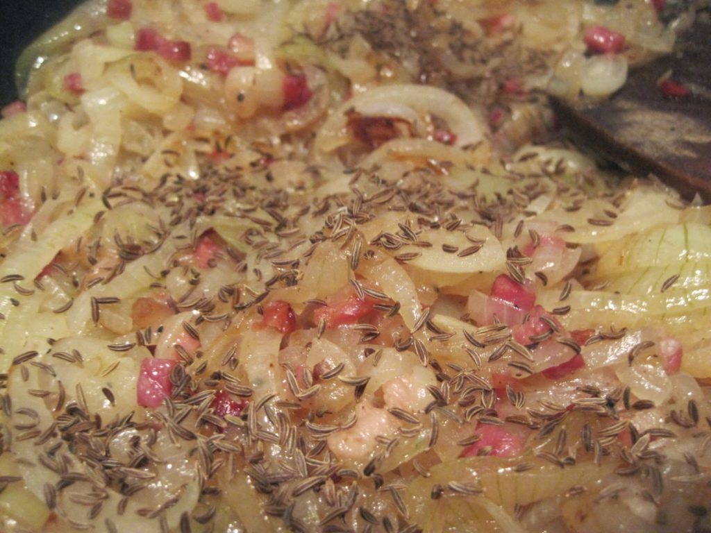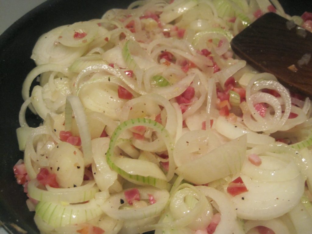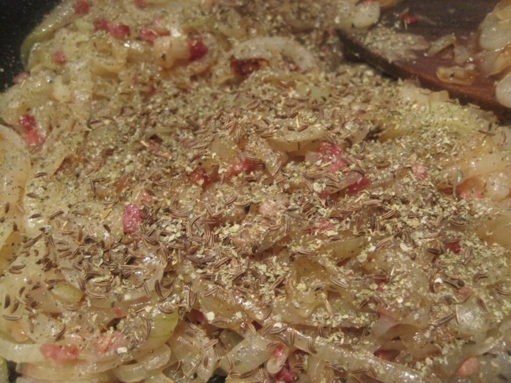 Zwiebeln und Schinkenwürfel bei mittlerer Hitze bräunen, bis die Zwiebeln weich sind. Dann noch einmal abschmecken und das dazu geben, was Euch geschmacklich noch fehlt.