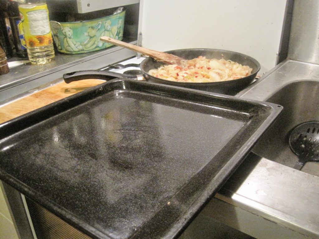 Während die Zwiebel noch in der Pfanne vor sich hinbräunen, können wir schon mal den Teig auf das Backblech rollen.
