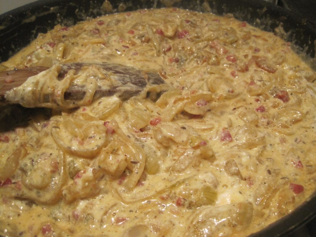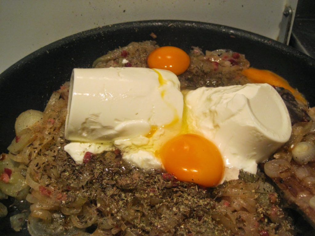 Das Ei und die Saure Sahne sind gestockt und bilden einen tollen geschmacklichen Kontrast zu den karamellisierten Zwieben und dem salzigen Schinken.