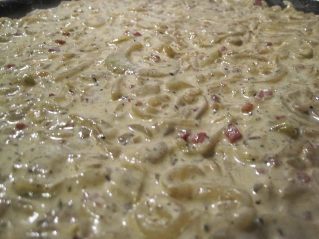 Hier seht Ihr die Zwiebelmasse auf dem Teig. Ich habe zum Rand  einen Sicherheitsabstand gelassen, weil das noch nach außen geht, wenn es im Ofen ist.