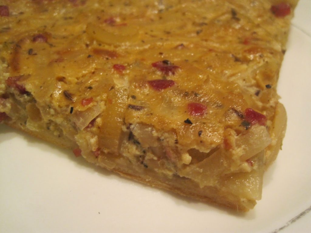 • Steht nächste Woche bei mir auf dem Programm 🙂 Ok, mit der kleinen Abwandlung, dass ich manchmal eine Variante ohne Speck mache (das freut die Veggies) und statt 2 Becher saurer Sahne 1 Becher saure und 1 Becher süße Sahne nehme. Und dass ich die Zwiebeln nicht mit Ei und Sahne mixe sondern die Zwiebeln auf den Teig streiche und dann die Sahne-Eier-Mischung drüber – ich finde, so kann man besser steuern, wie flüssig das Ganze werden soll…