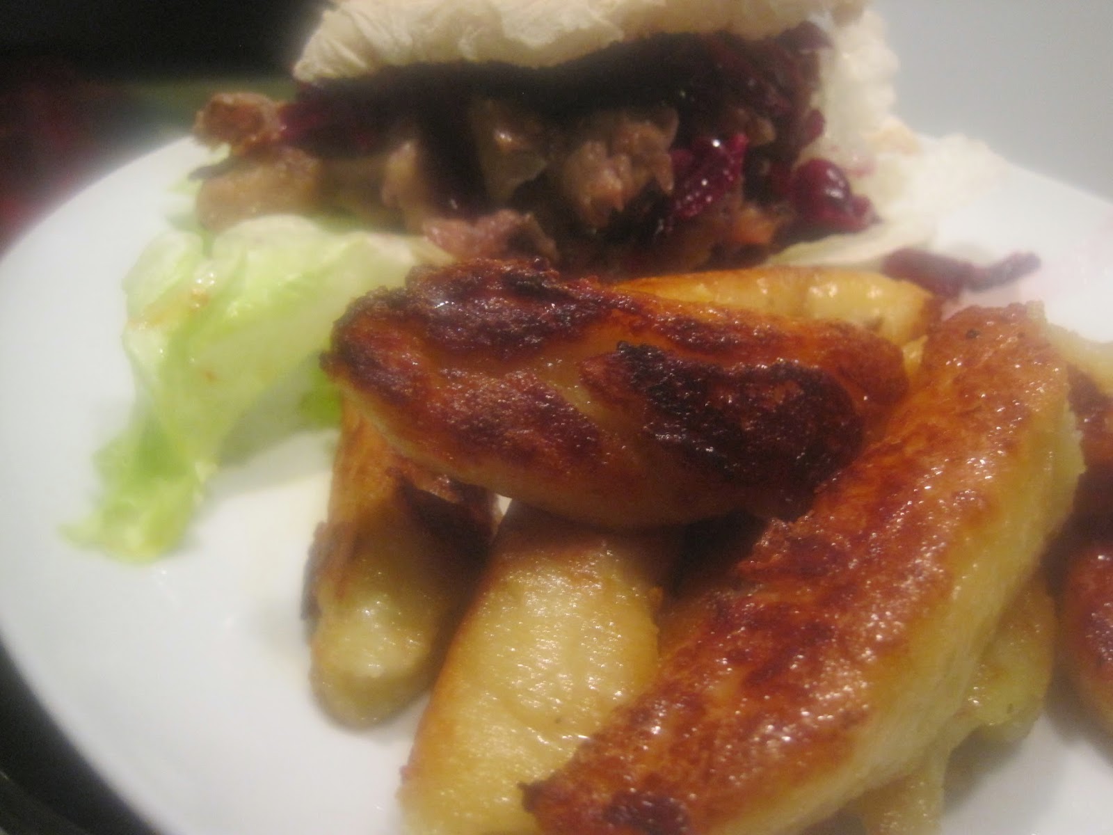 Das ist eine tolle Beilage, die man einfach probiert haben sollte. Kartoffelig wir Kloßteig, dann wiederum kross gebraten auf den Aussenseite und geschmacklich ganz toll, durch Salz, Pfeffer und Muskatnuss.