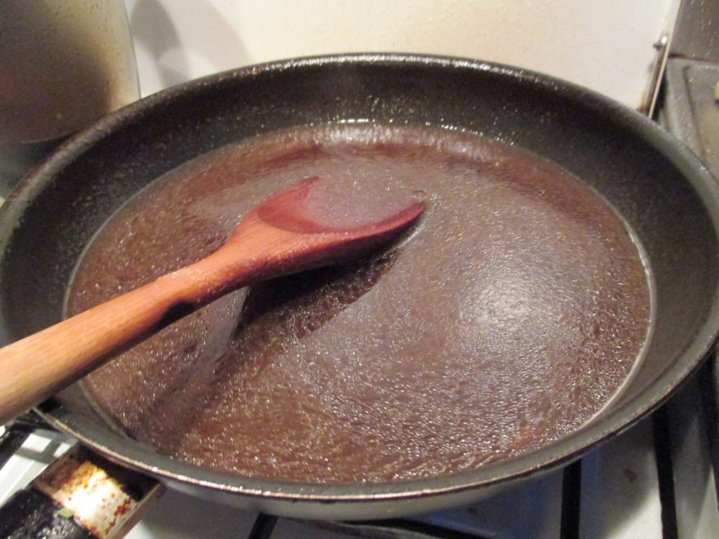 Die aufgelöste Stärke, Löffel für Löffel, in die Soße einrühren und die Soße dabei aufkochen, damit sie sämig wird. Wer keine Kinder am Tisch hat, kann auch noch einen Schuß Cognac, Brandy, Wodka, oder irgendwas anderes scharfes dazu geben. Das macht immer einen guten Geschmack.