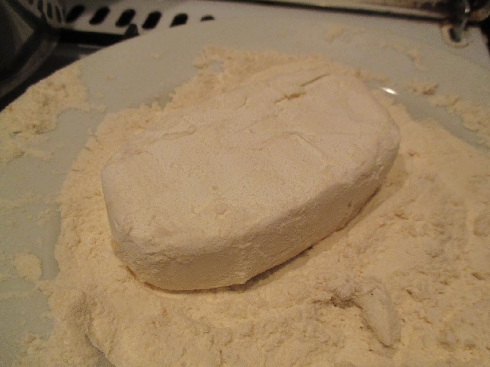 Camembert in Mehl drücken und das auf allen Seiten wiederholen.