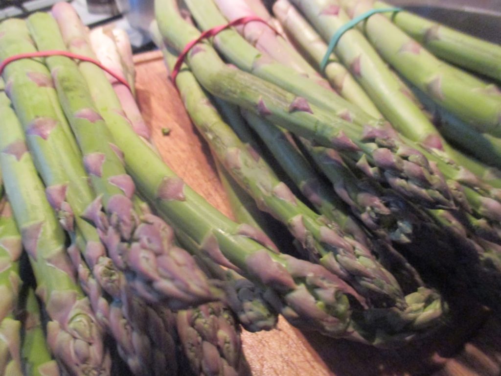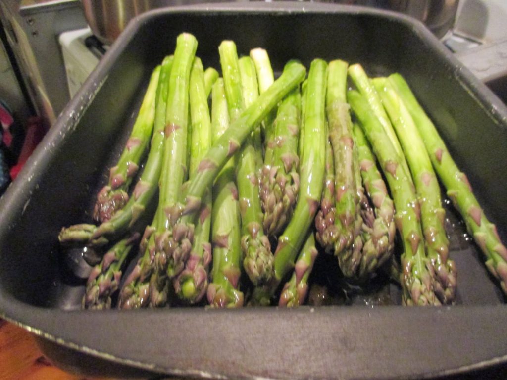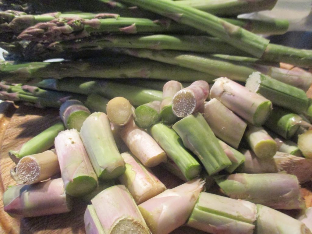 Ich habe mir statt einem Kilo Spargel, gleich 1,5 Kilo gekauft und von einem Pfund, plus den Abschnitten des Stangenspargels, der in diesem Rezept verarbeitet wird, eine Spargelsuppe aus grünem Spargel gekocht. Das ist meine Politik nichts umkommen zu lassen und dass die verschiedenen Gerichte irgendwie miteinander zu tun haben sollen. Dann macht man sich viele Arbeiten nur ein Mal, oder es ist insgesamt nachhaltig, weil man weniger Verschnitt und Müll hat. Hier geht alles ganz schnell. Wenn Ihr den Spargel anfangt zu bearbeiten, gleich schon mal den Ofen anstellen. Ich habe einen Gasofen, nehme zwischen Temperatur 5 und 6, Ihr solltet 200 Grad nehmen.