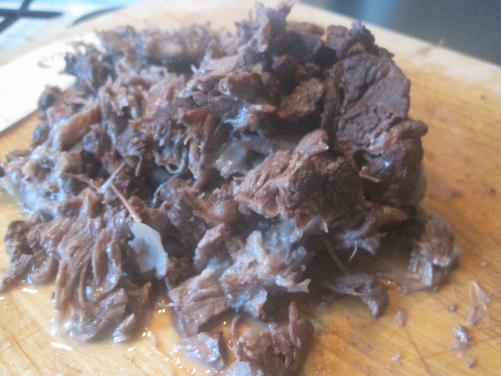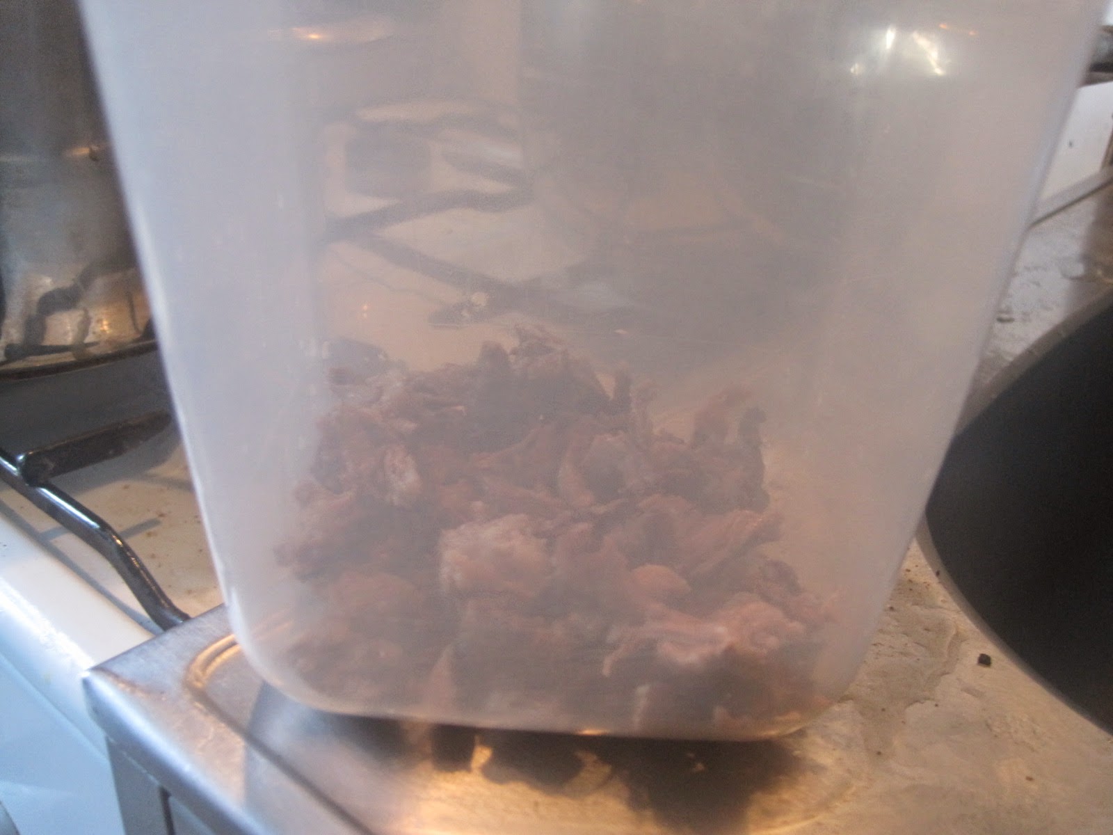 Das Fleisch habe ich dann erneut mit dem Keramikmesser in noch keinere Stücke geschnitten und wenn ich irgendwas knorpeliges geunden habe, abgeschnitten und aussortiert. Das ist aber zu vernachlässigen.