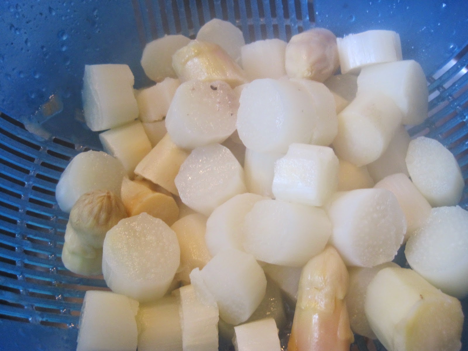 Spargel nach 10 Minuten mit dem Schaumlöffel aus dem Wasser heben und die Flüssigkeit NICHT wegkippen. Wir brauchen noch eine Basis für unsere Sülze!!