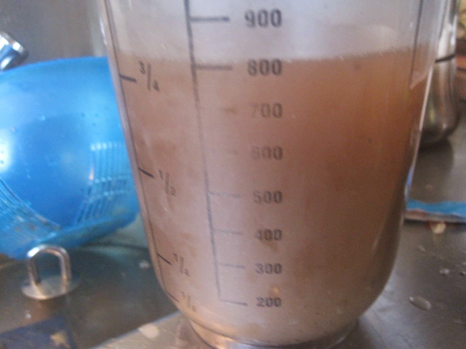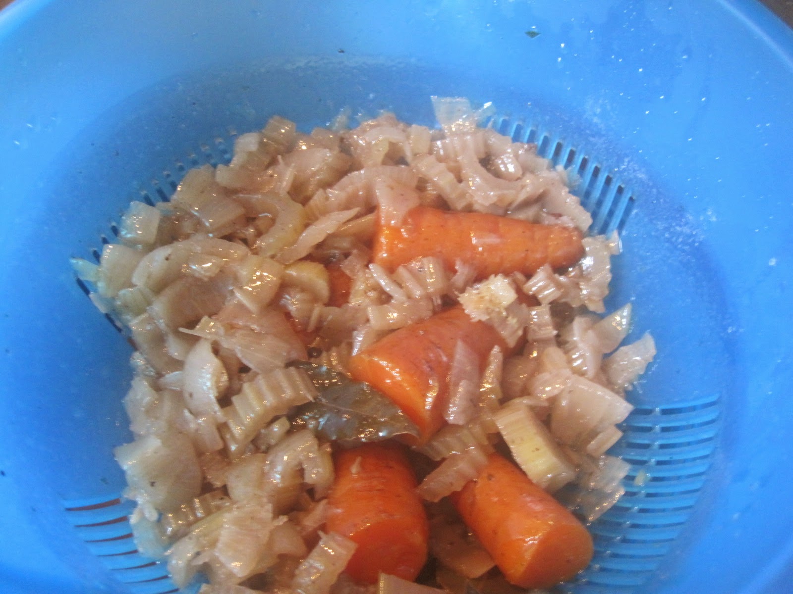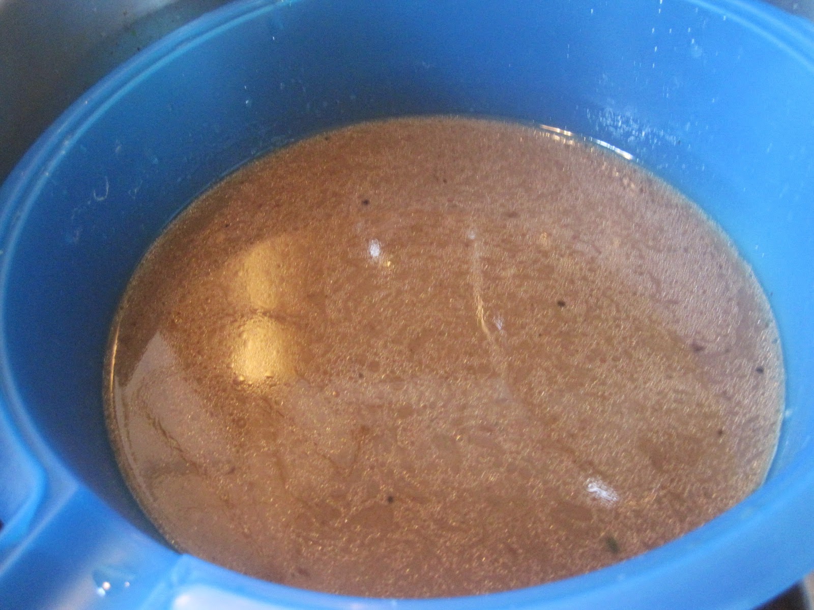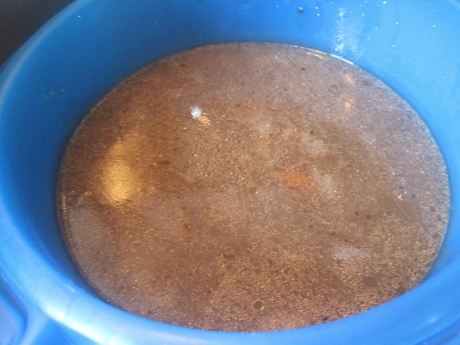 Die Brühe habe ich durch ein Sieb in eine Schüssel abgekippt, um die Feststoffe grob heraus zu bekommen.