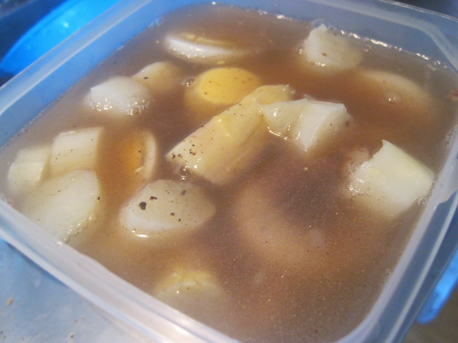 Schnell noch die Eier abpellen und in Scheiben schneiden. Dann kann es ans Befüllen des Behälters für die Sülze gehen.