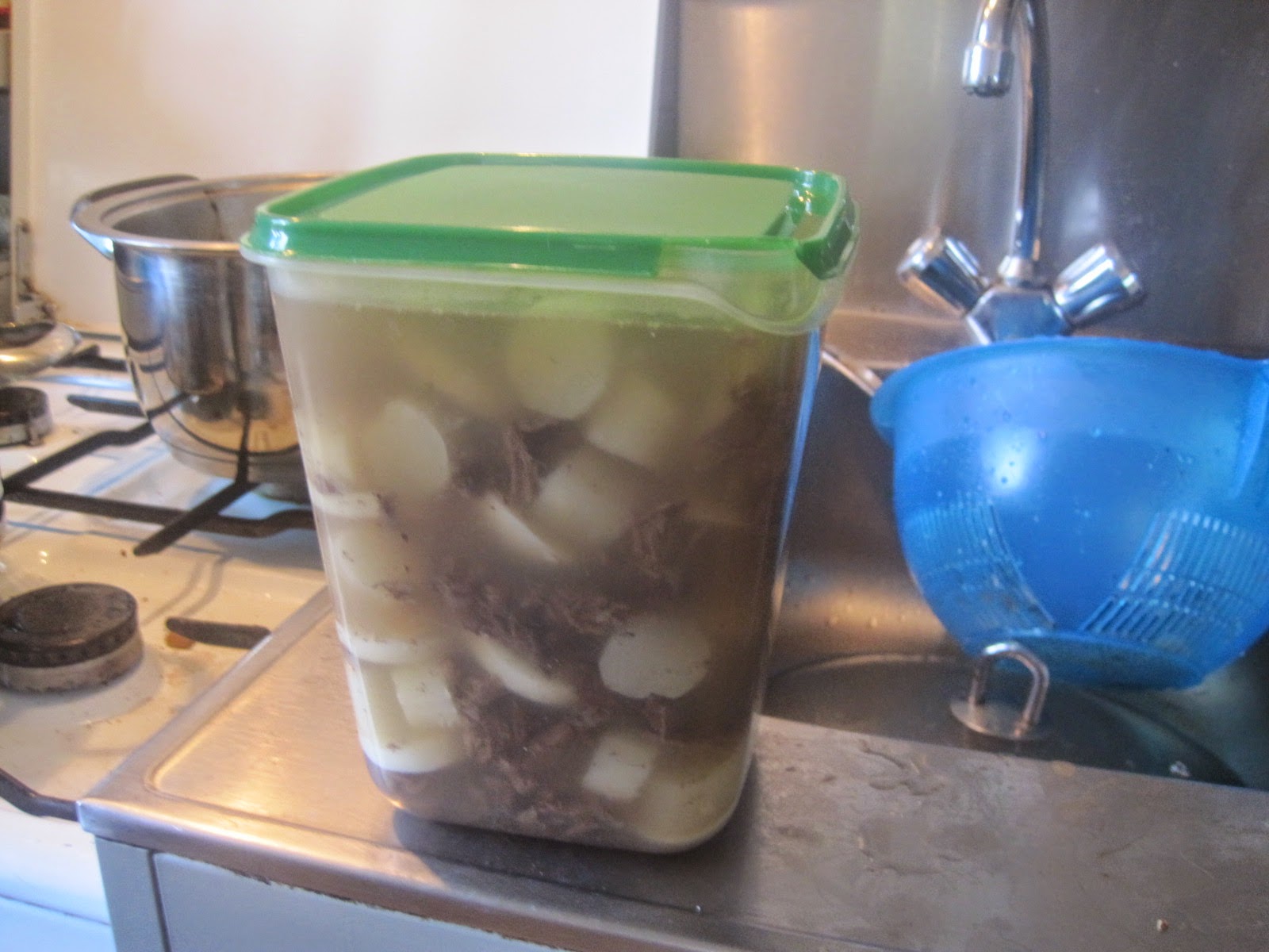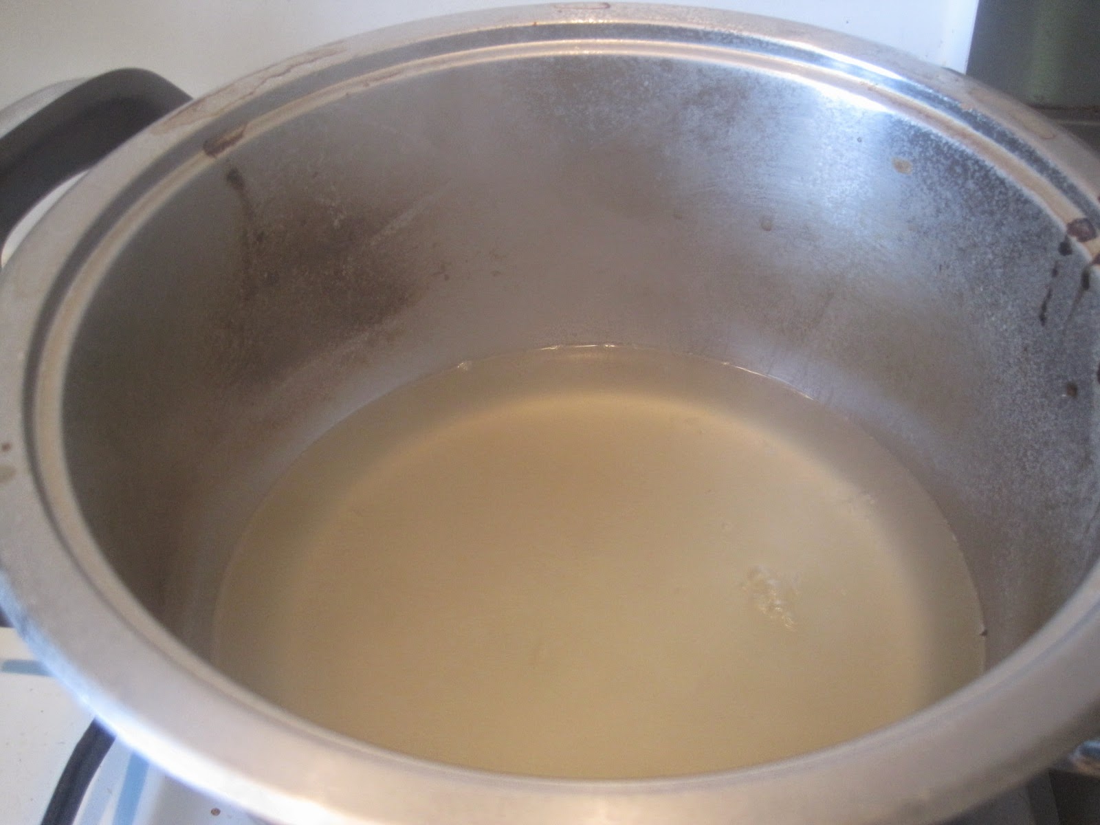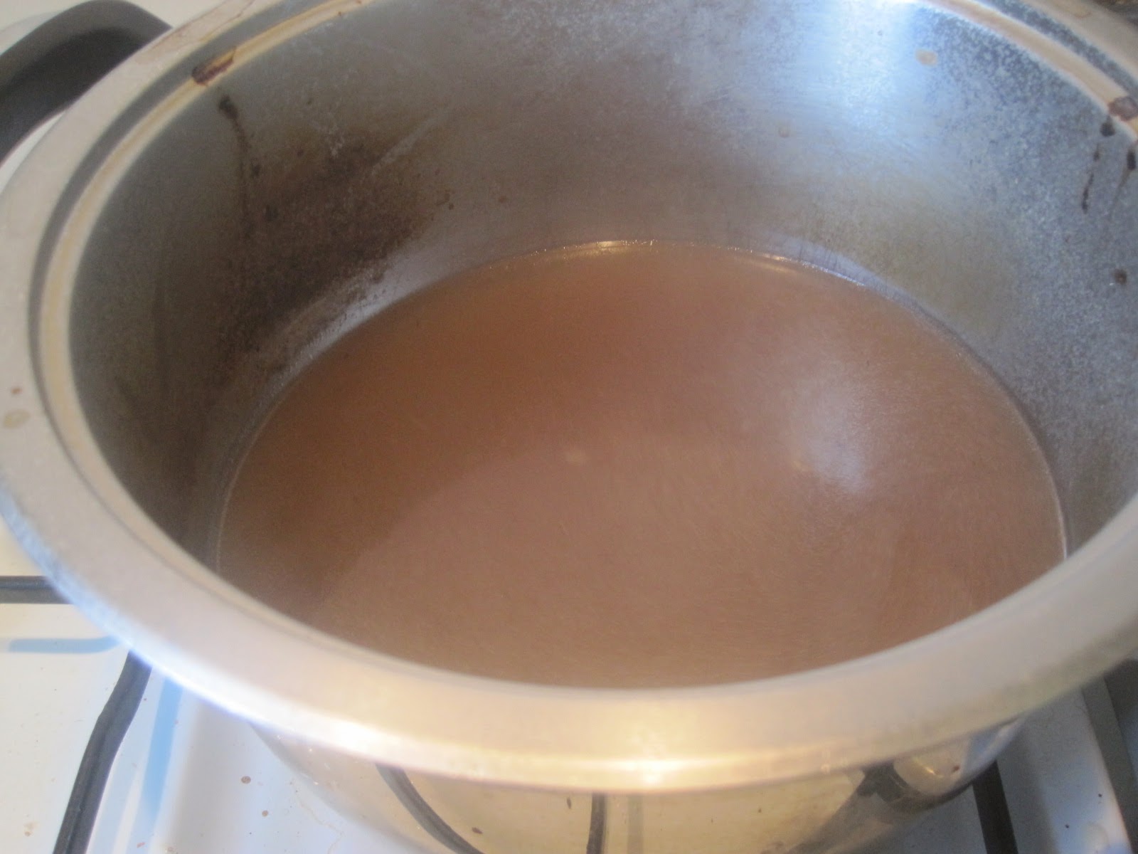 Hier ist die Brühe aufgefüllt. Deckel auf den Topf legen und auf der kleinsten Herdplatte auf kleinster Stufe drei Stunden vor sich hin köcheln lassen. In der Zeit kann man schlafen, lesen, vögeln, zum Einkaufen gehen, die Eier kochen, oder schon den Spargel schälen und vorkochen. Alles kann, nix muss.