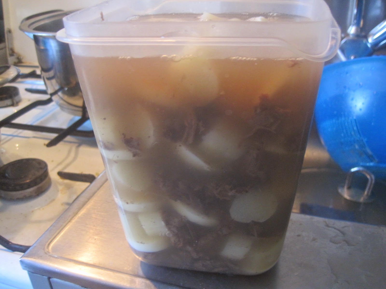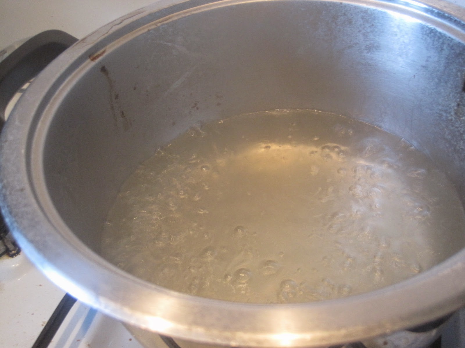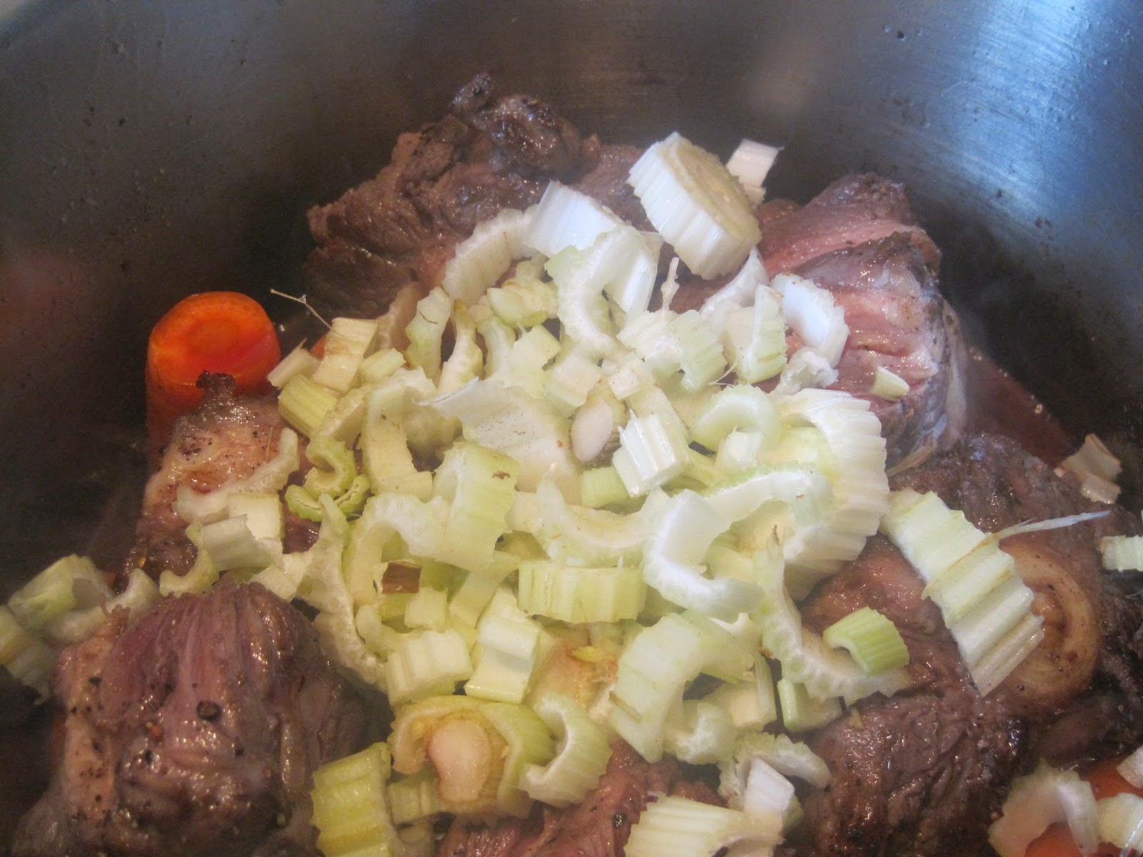 Hier ist die Brühe aufgefüllt. Deckel auf den Topf legen und auf der kleinsten Herdplatte auf kleinster Stufe drei Stunden vor sich hin köcheln lassen. In der Zeit kann man schlafen, lesen, vögeln, zum Einkaufen gehen, die Eier kochen, oder schon den Spargel schälen und vorkochen. Alles kann, nix muss.