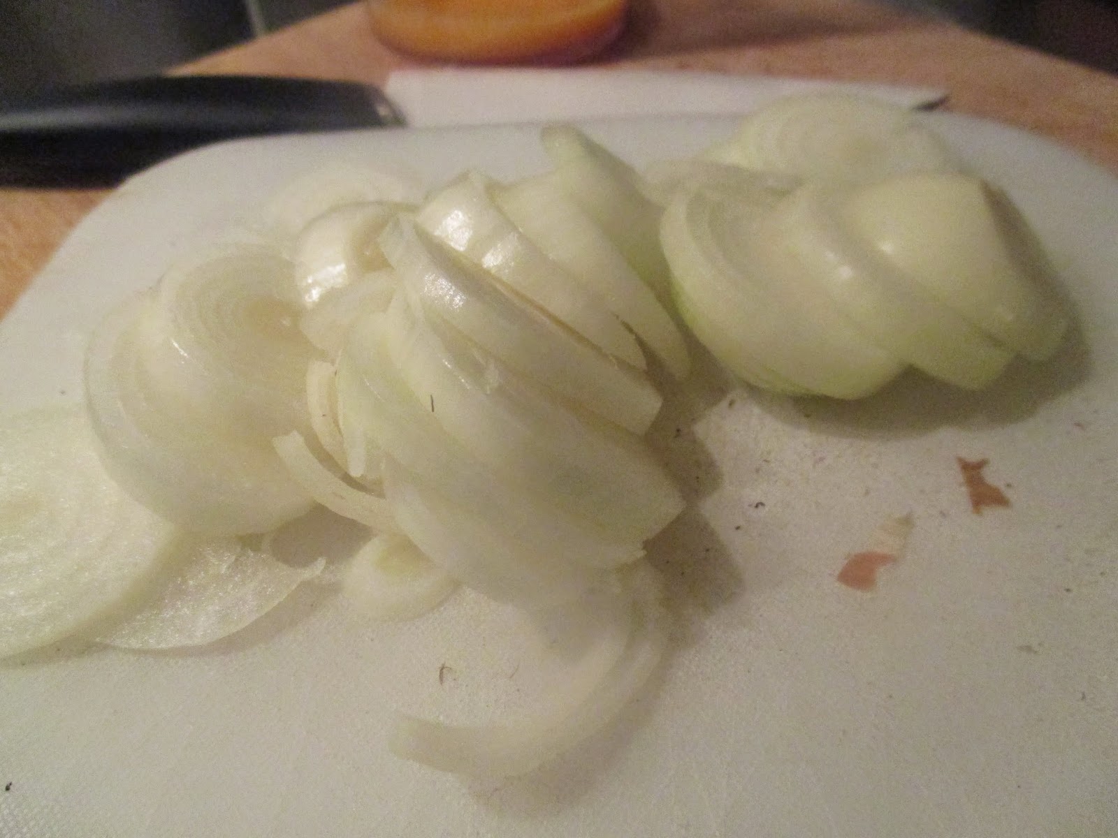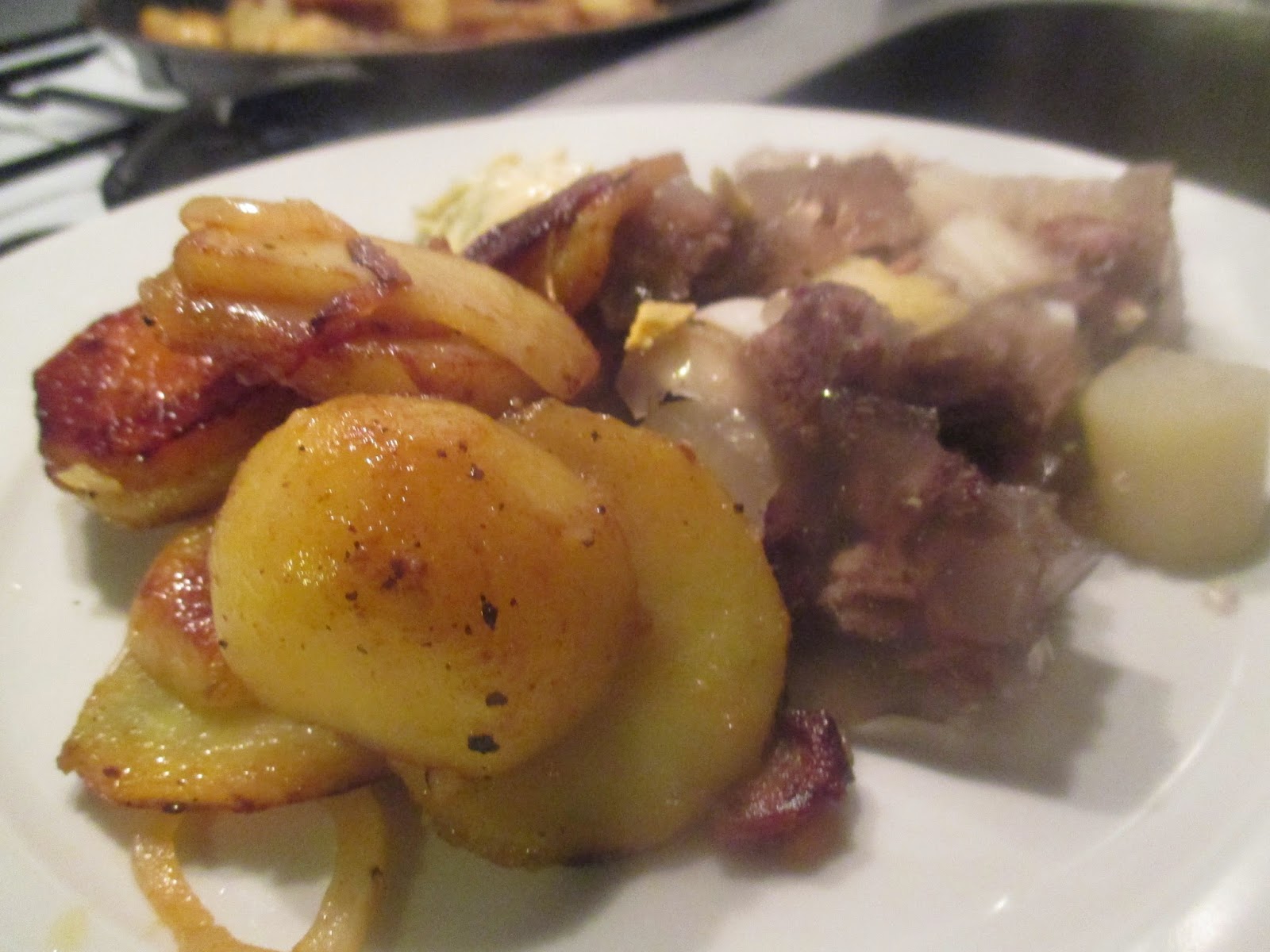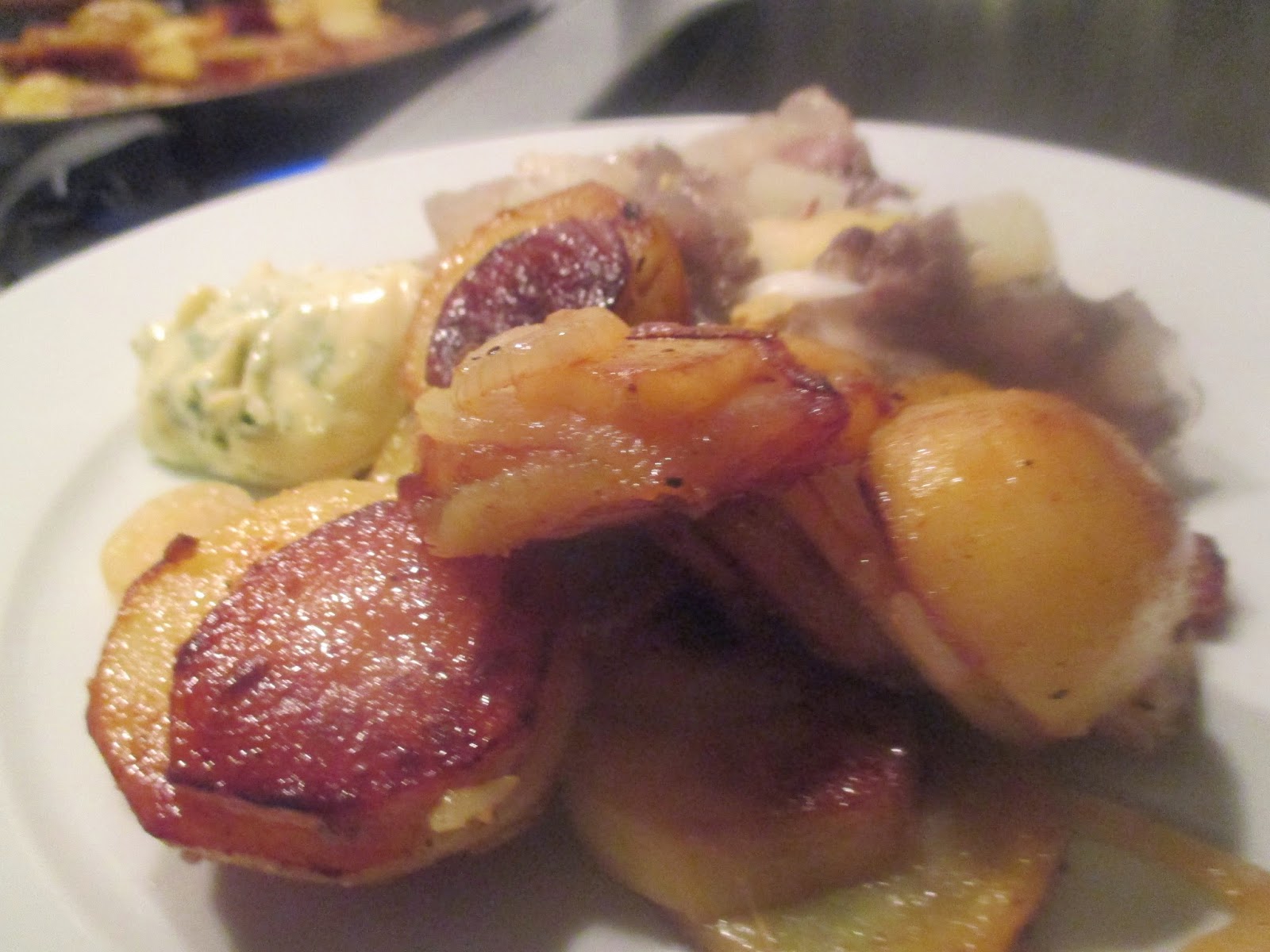 Nach zehn Minuten Bratzeit der Kartoffeln, wenn also noch zehn Minuten Restzeit übrig sind, werfe ich die Zwiebeln in die Pfanne. Sonst werden sie mir zu leicht schwarz. Ich könnte natürlich auch mal meine Zubereitungstemperatur überdenken, aber dann habe ich wieder Bammel, dass die Kartoffeln nicht kross werden. Also Zwiebeln nur in den letzten zehn Minuten in die Pfanne geben, oder es besser wissen als ich und mir dann auch mitteilen.