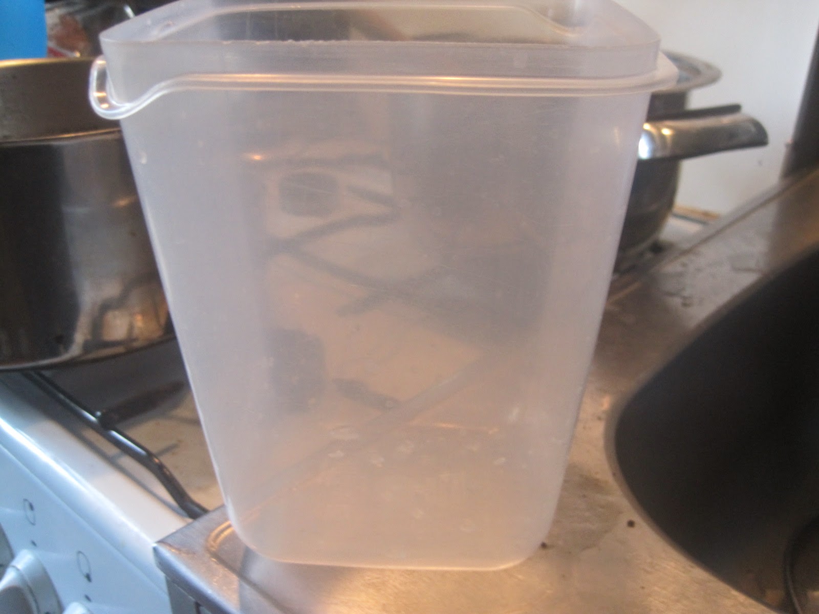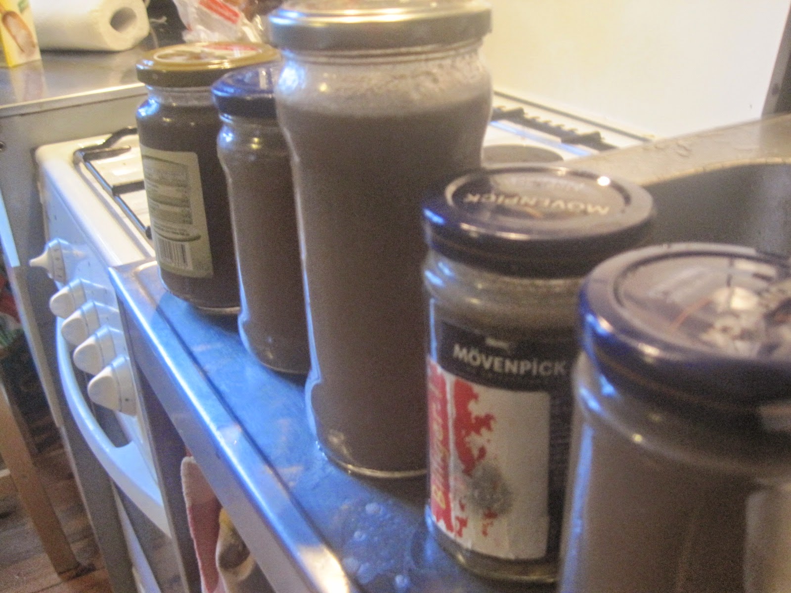 Deckel drauf und ab in den Kühlschrank, wenn die Masse auf Zimmertemperatur runter gekühlt ist. Bis dahin habe ich den Topf draussen auf der Fensterbank stehen lassen.