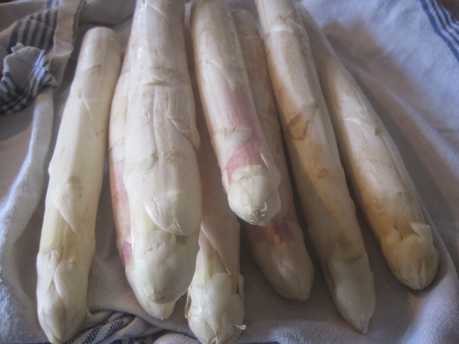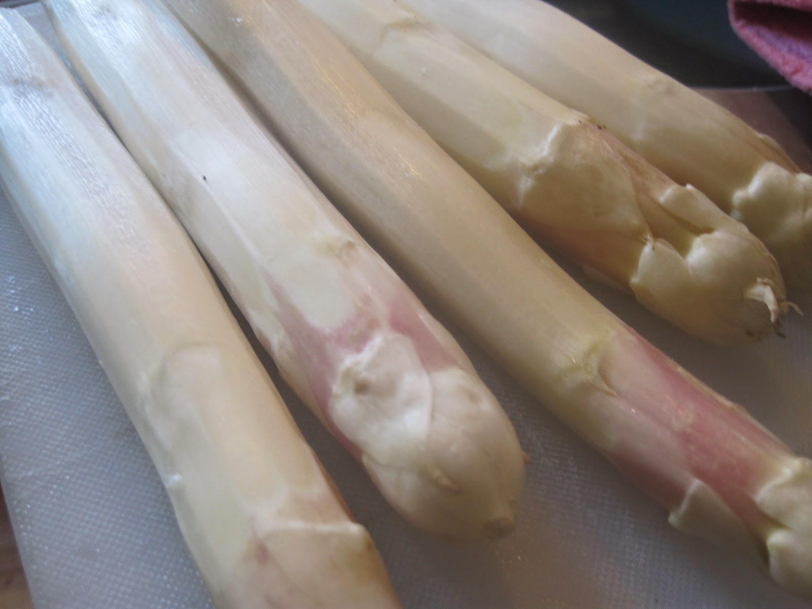 Spargel, den ich mit dem Sparschäler schnell von der Haut und den hinteren Abschnitten befreie.