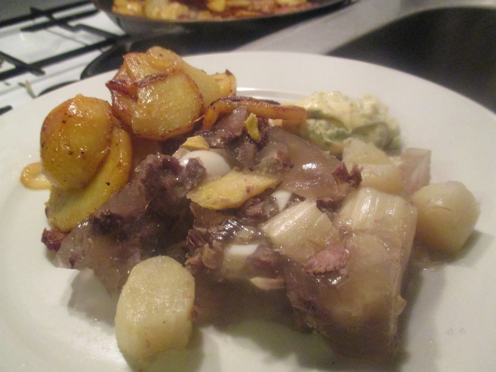 Und dann kann der Hunger bekämpft werden. Das ist extrem lecker, mit dem zarten Ochsenschwanz, dem tollen Spargel, den Eier, die irgendwie in jede Sülze gehören und der gelierten Brühe mit dem Spargelsud. Das passt einfach zu sammen, macht ein schönes Mundgefühl und schmeckt wahnsinnig lecker in Kombination mit den Bratkartoffeln und der Mayonnaise.