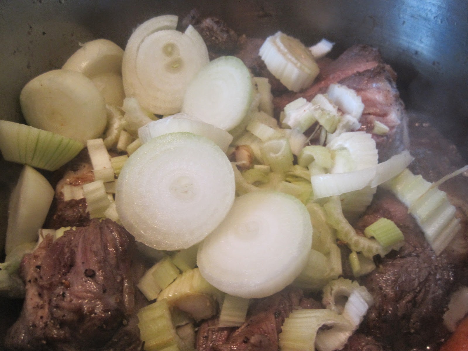 Wenn das Fleisch Farbe bekommen hat, kommt das Gemüse dazu