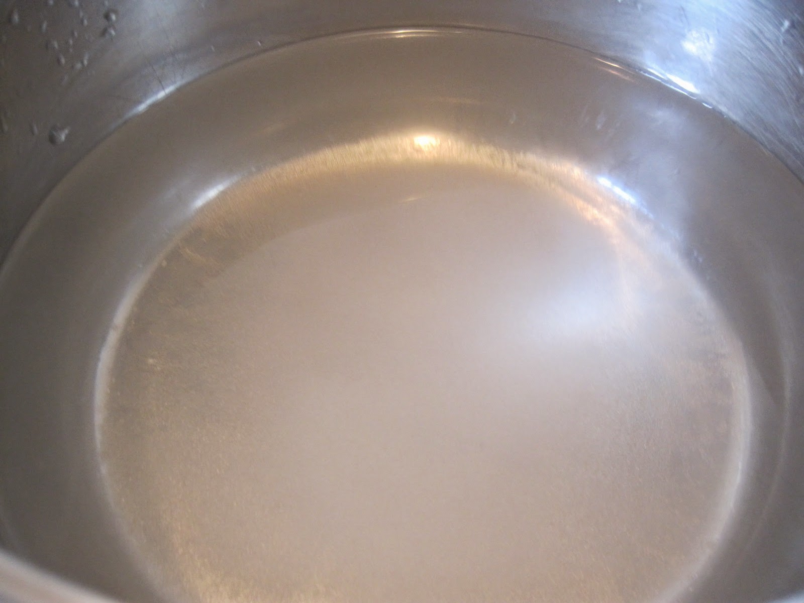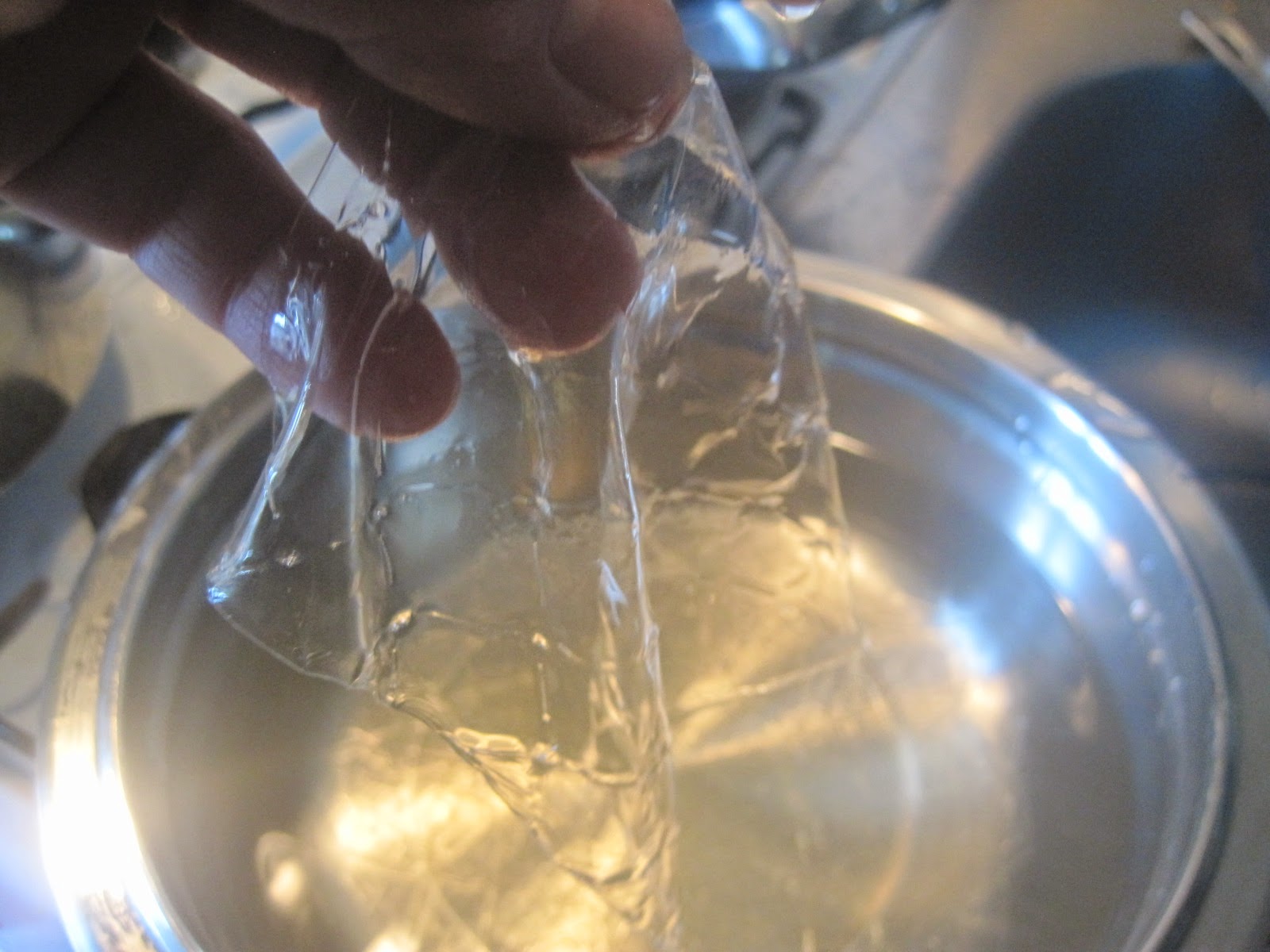 Die Flüssigkeit muss nun abkühlen, weil Gelatine nicht über siebzig Grad verwendet werden soll, sonst wird das nicht fest, wenn die Flüssigkeit noch zu heiß ist, wenn man die Gelatine darin verrührt.