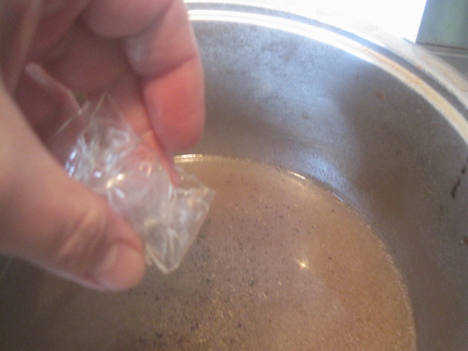 Die ausgedrückten Gelatineblätter, einzeln in die Spargelsud-Ochsenschwanzbrühe Mischung legen und mit einem Kochlöffel umrühren, damit nichts verklumpen kann. Ich habe die ganze Packung mit 12 Stück genommen, das hat sich bewährt. Sülze die nicht hart wird, ist so ziemlich das Zweitschlimmste, was nicht hart wird, wenn man es braucht.