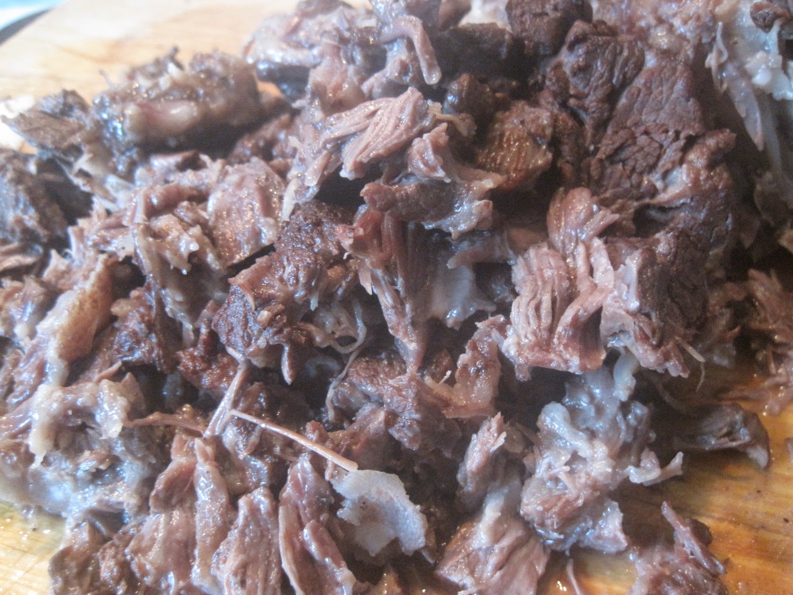 Das Ochsenschwanzfleisch wird mit den Fingern, oder mit einem Messer von den Knochen gelöst. Das ist durch das schonende Schmoren total zart und fällt so von den Knochen.