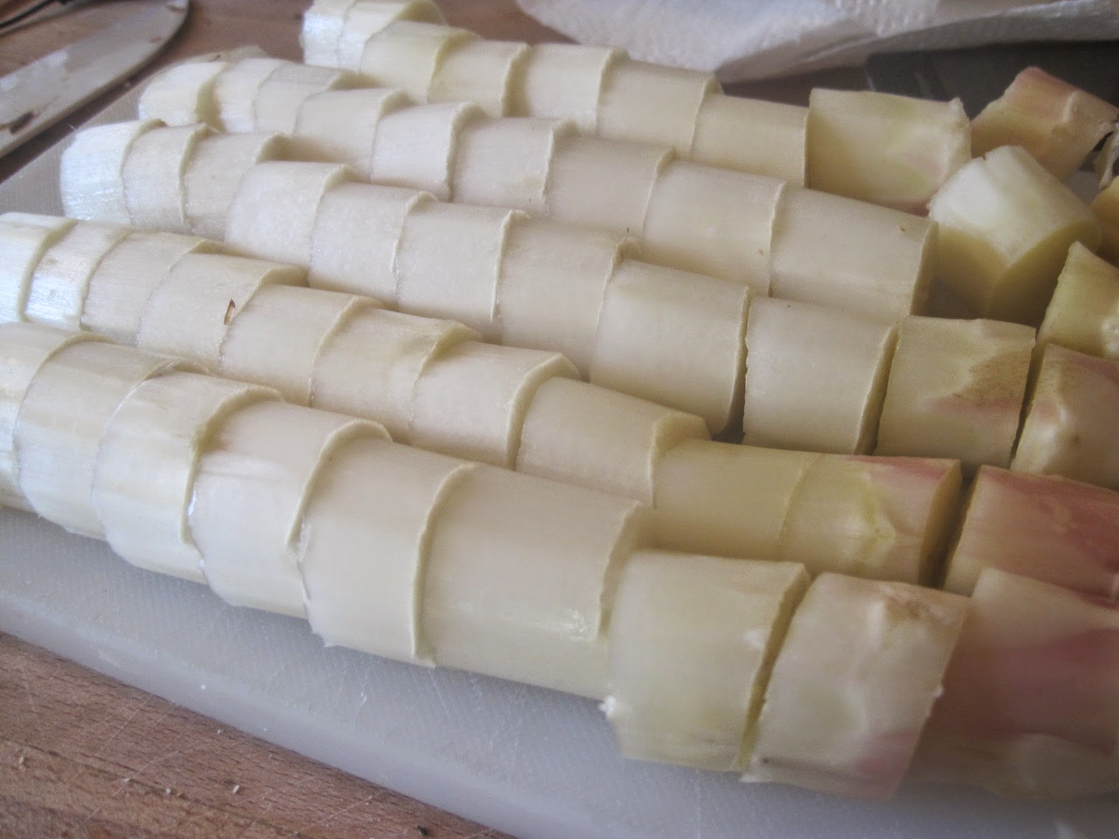 Die geschälten Spargelstangen in dicke Stücke schneiden.