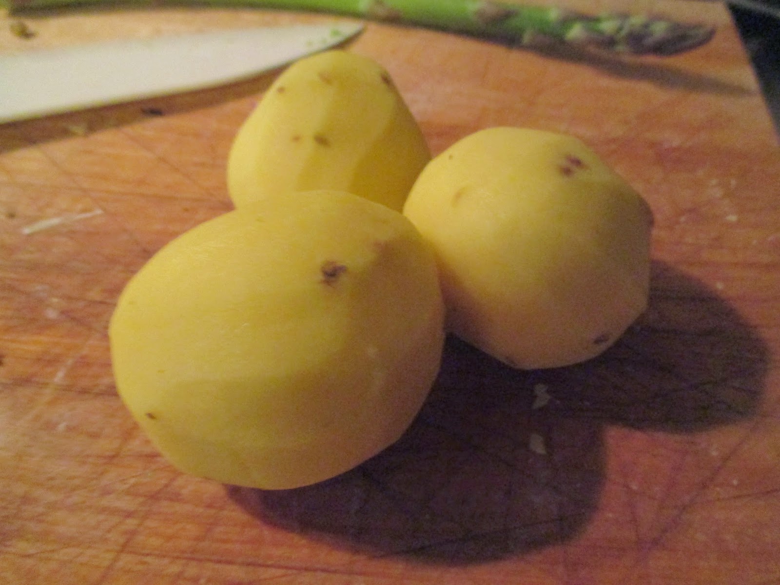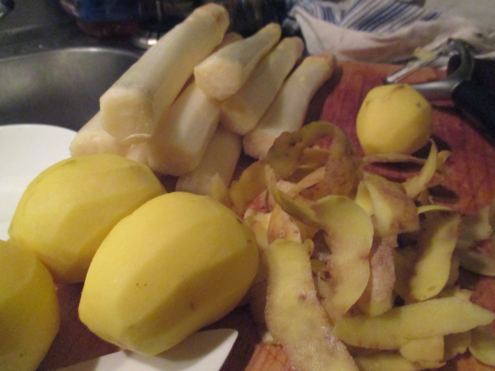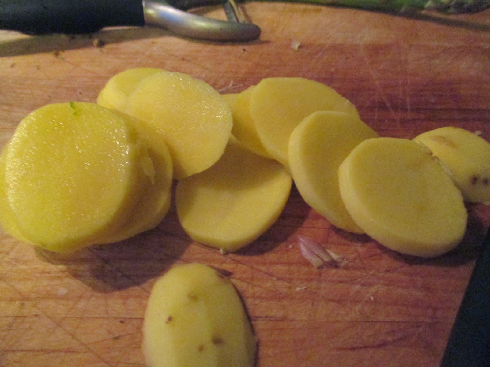 Jetzt kommt die Abteilung Raffinesse. Andere werfen Toastbrot in ihre mühevoll gekochte Spargelsuppe. Habe ich früher auch gemacht und manchmal ist es eben so. Heute machen wir das mal auf chic. Drei Kartoffeln schälen und erst in dünne Scheiben schneiden.