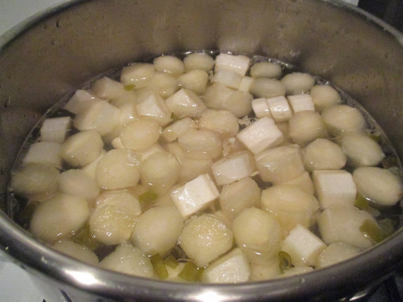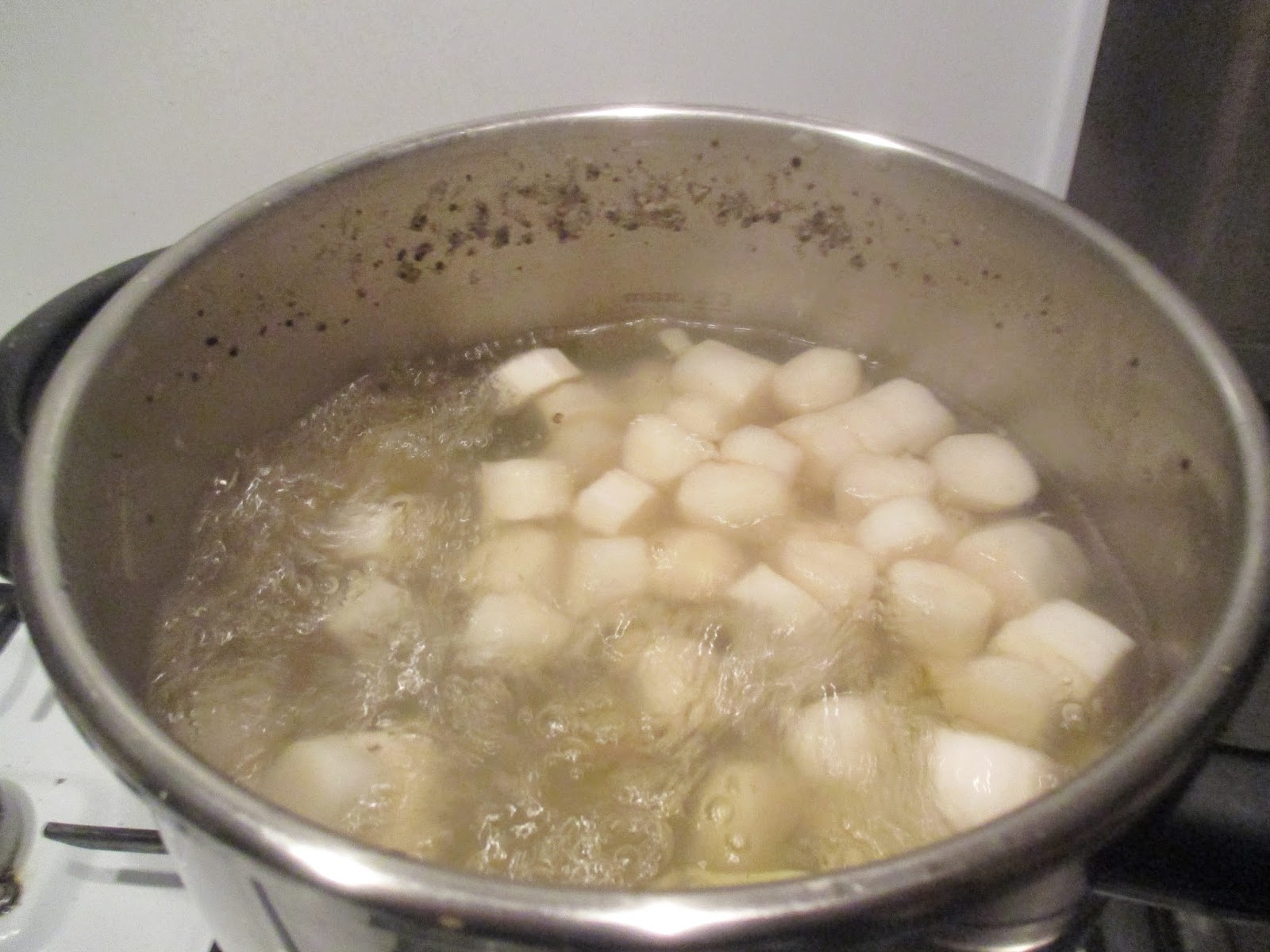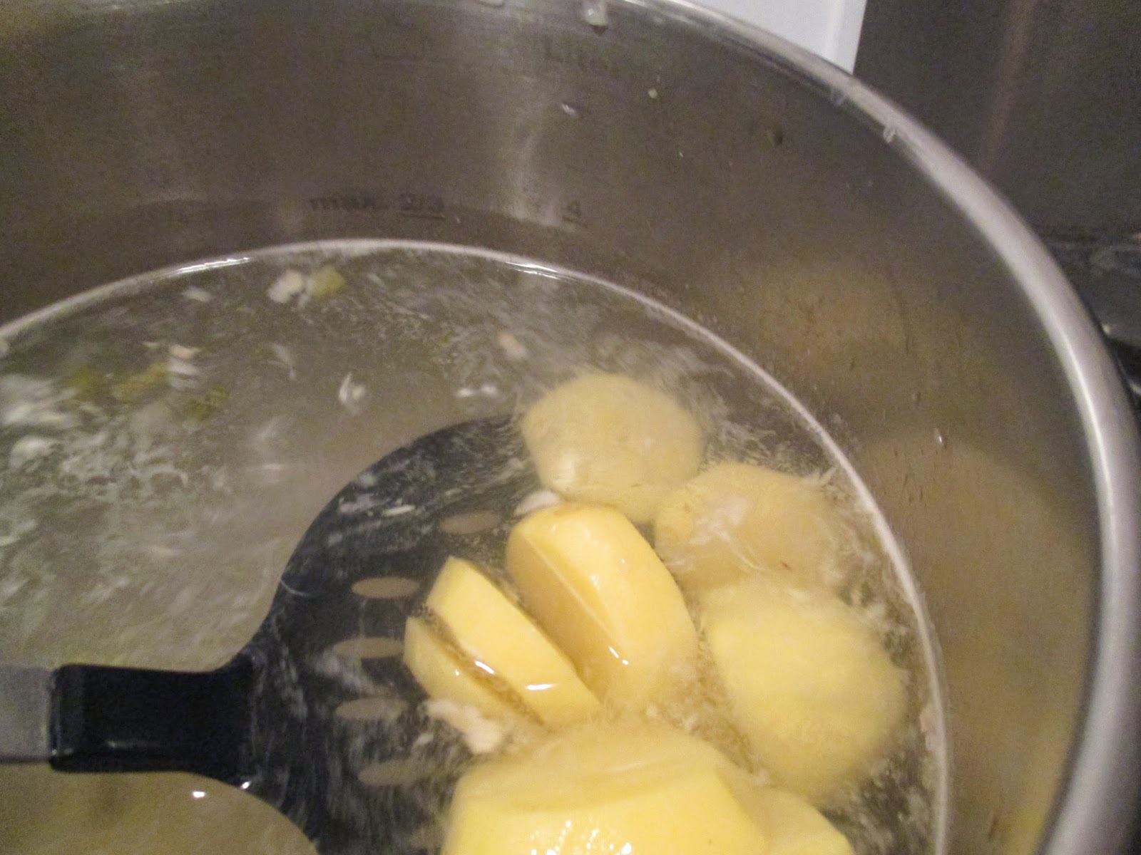 Die vier Kartoffeln kommen in den Topf. Vorher schneide ich sie in Scheiben, damit man sie hinterher gut pürieren kann.
