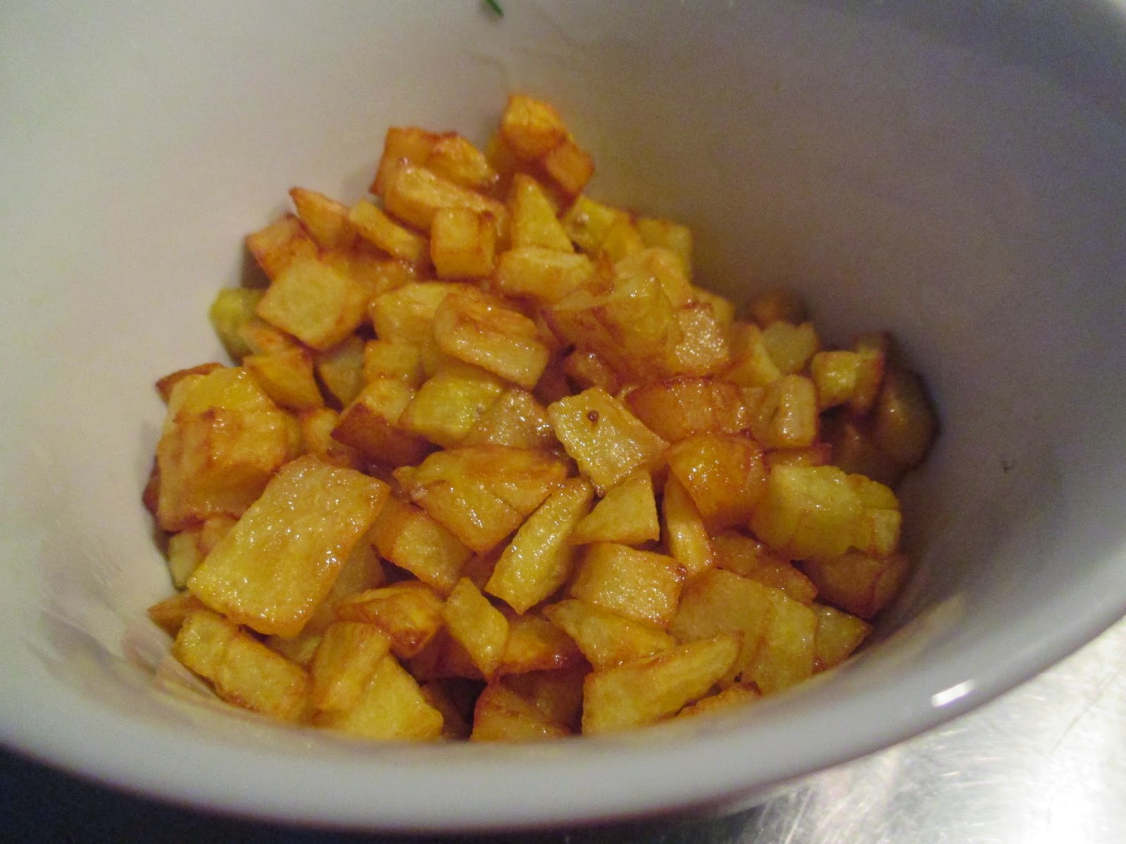 So sollen die Kartoffelcroutons aussehen. Die werden mit dem Schaumlöffel aus der Pfanne geholt. Man kann sie dann kurz auf Küchenkrepp entfetten, oder auf dem Schaumlöffel abtropfen lassen.