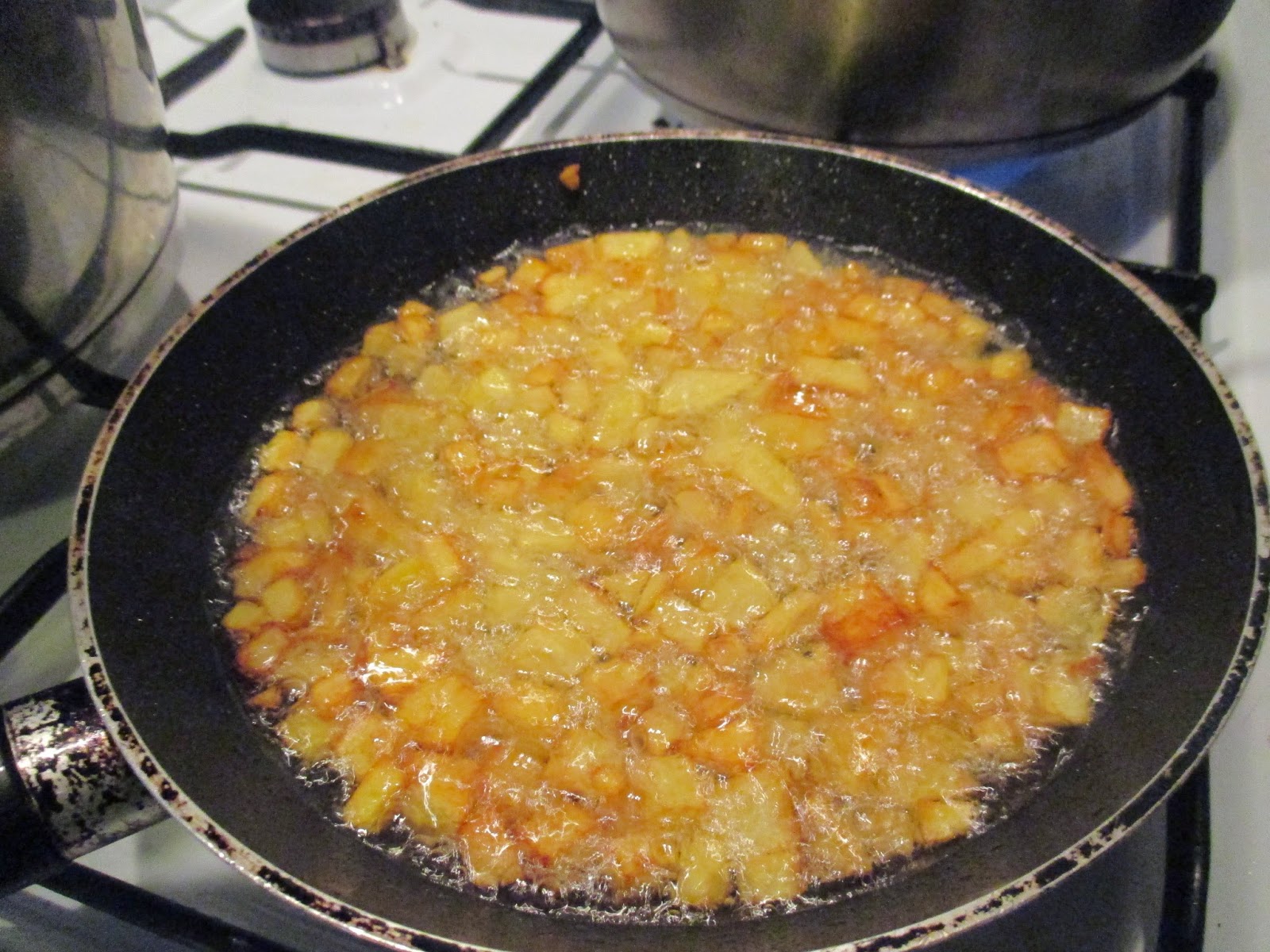 Wenn das Fett heiß ist, die Kartoffelwürfel ins Fett geben und ausbacken, bis sie eine gesunde Gesichtsfarbe haben.
