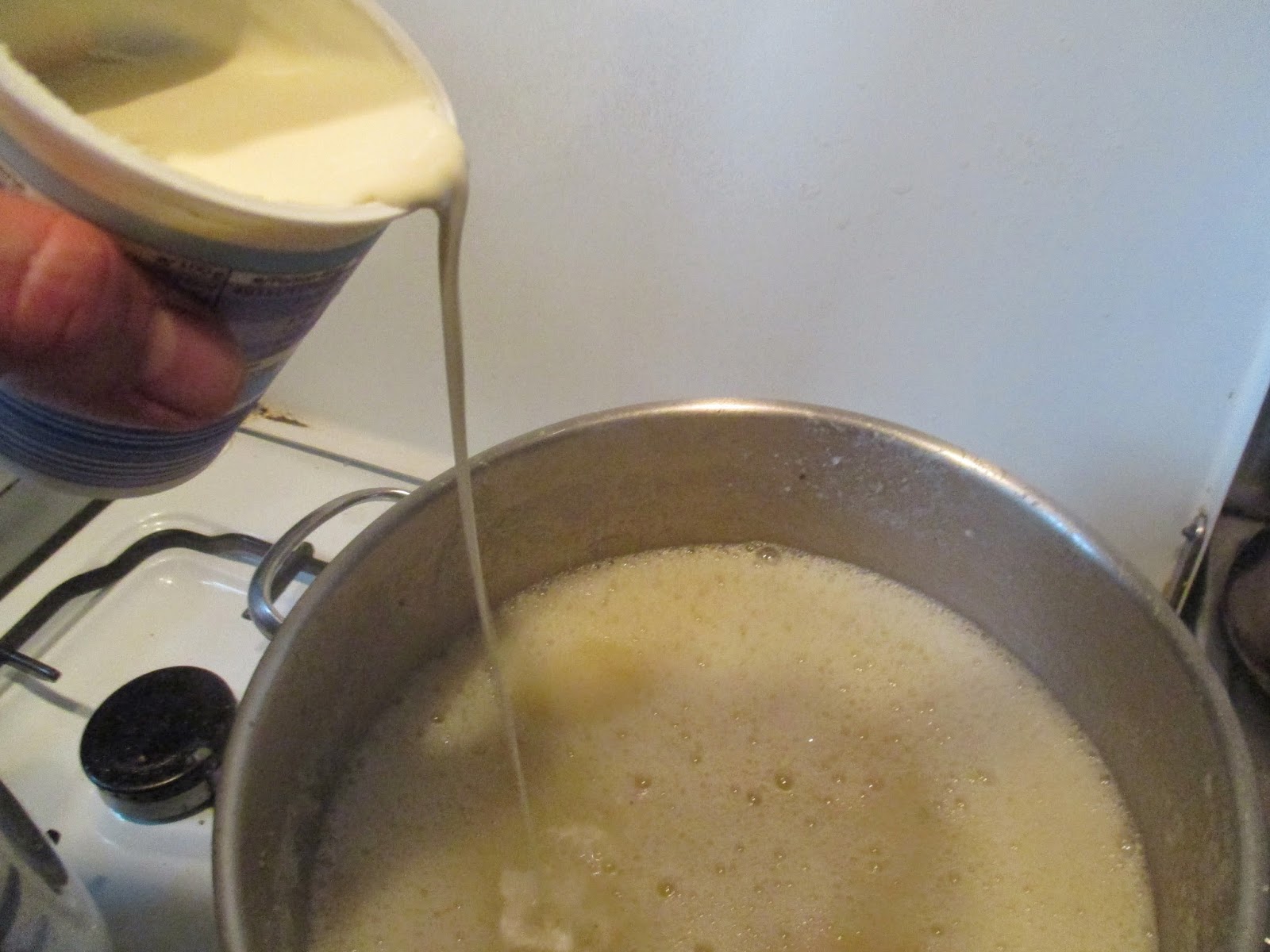 Zum weiteren Andicken und für den guten Geschmack, einen Topf Sahne in die Blumenkohlsuppe kippen und aufkochen.