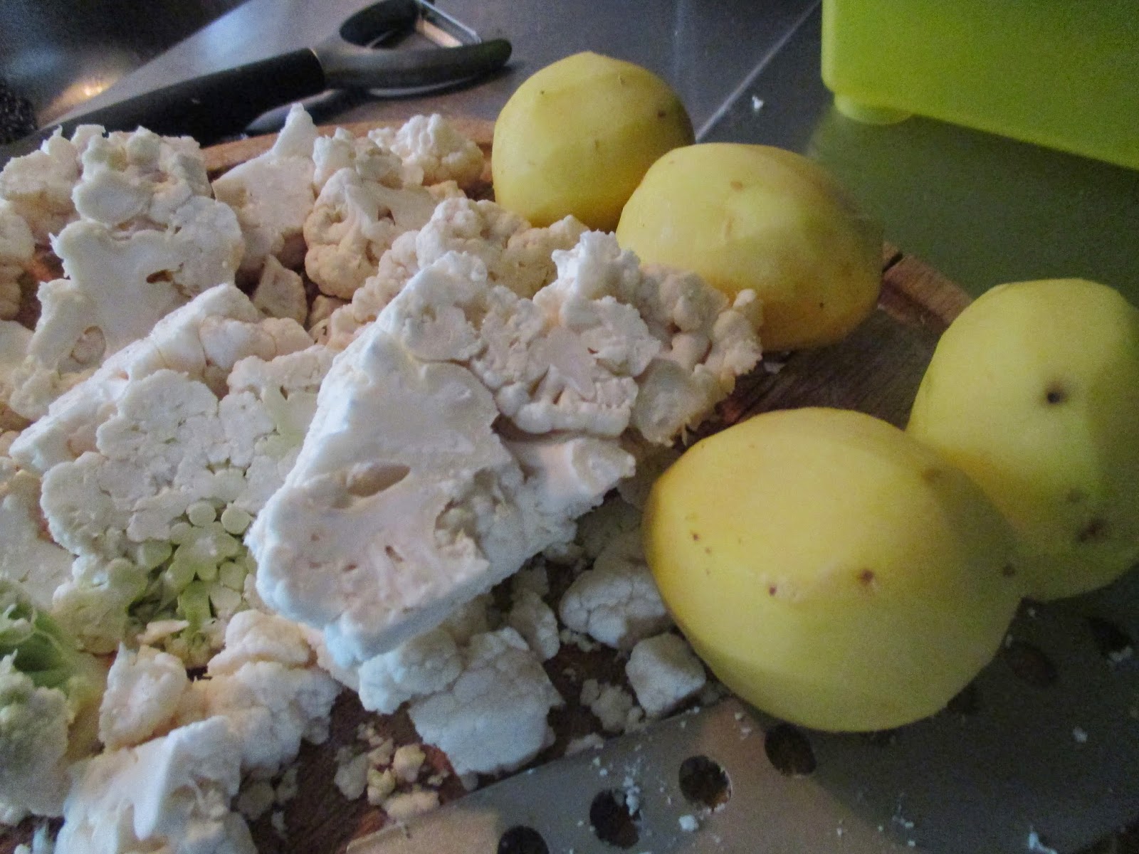Kartoffeln in Scheiben schneiden, dann lassen sie sich nach dem Kochen in der Suppe besser pürieren. Auf dem Brett seht Ihr noch das restliche Drittel Blumenkohl, das jetzt noch nicht mitgekocht wird.