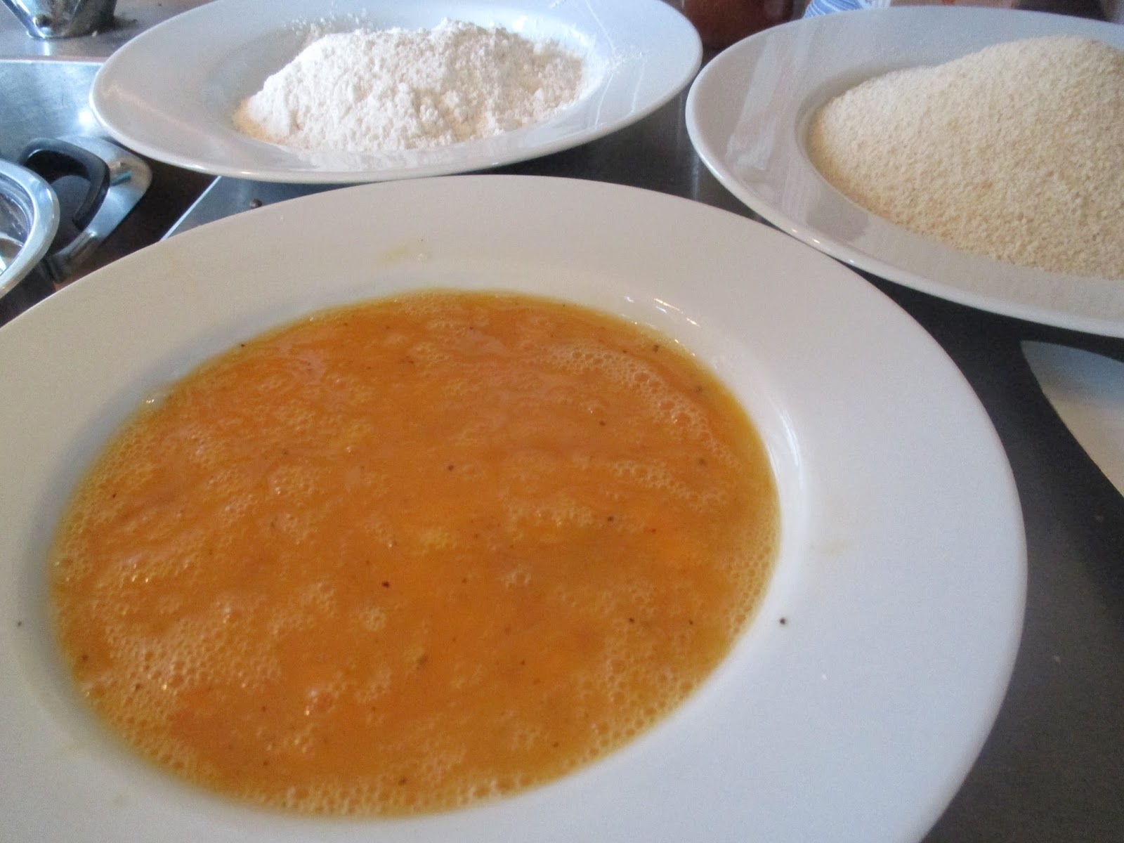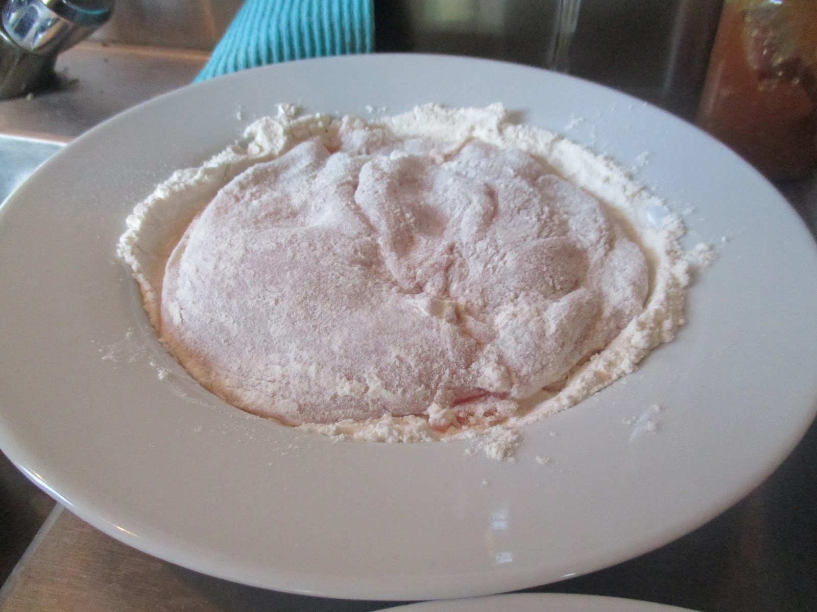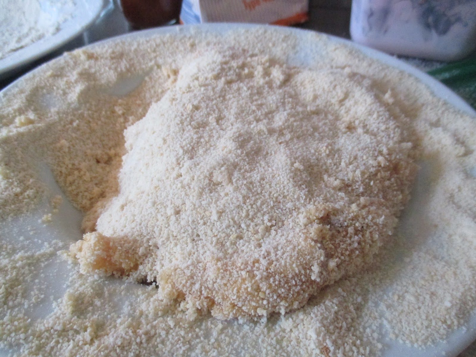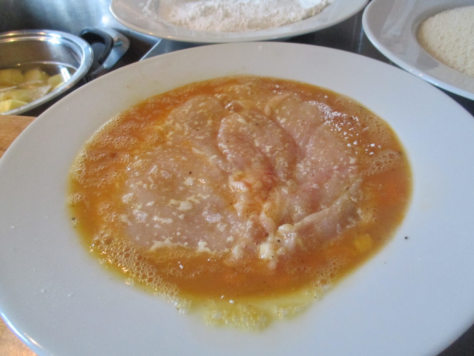 Immer schön darauf achten, das Fleisch komplett mit Mehl bedeckt ist und dass in diesem Arbeitsgang eben überall Eimasse am Schnitzel klebt, sonst hält die Panierung nicht.