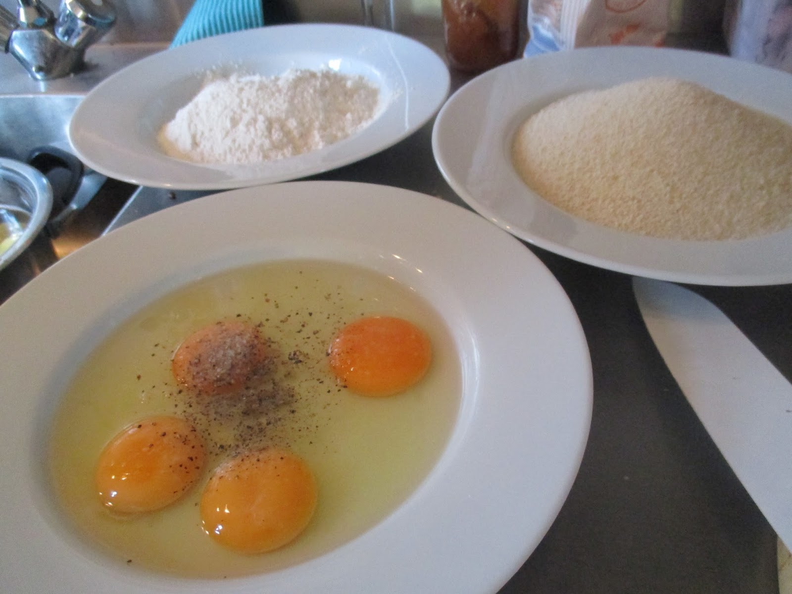 Zum Panieren der Schnitzel habe ich das klassische drei Teller System benutzt. Ein Teller Mehl, ein Teller verquirltes Ei, das mit Salz und Pfeffer dazu gebracht wurde, gescheit zu schmecken und einen Teller Paniermehl.
