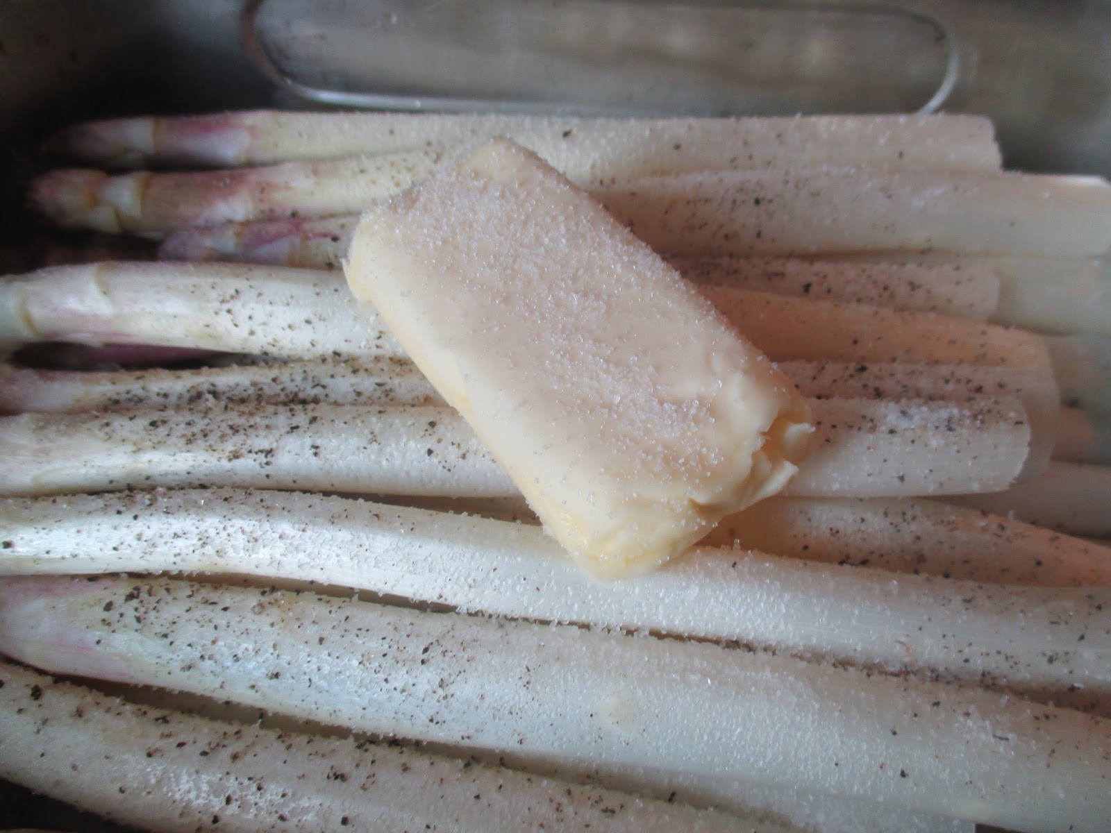 Den Spargel kann man klassisch auf dem Herd im Topf, oder ganz neumodisch im 2015 Style als Butterspargel in 20 Minuten bei 200 Grad im Ofen garen