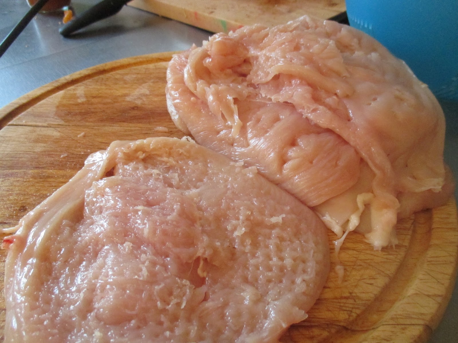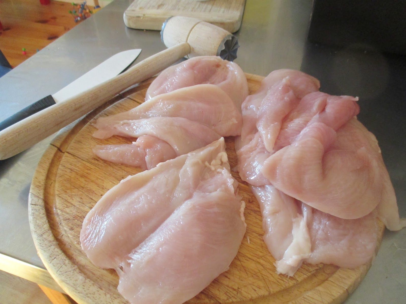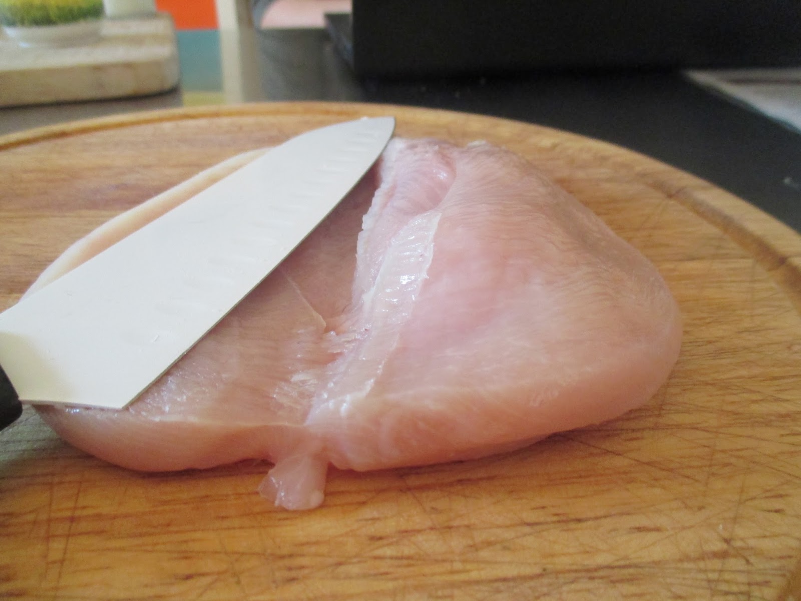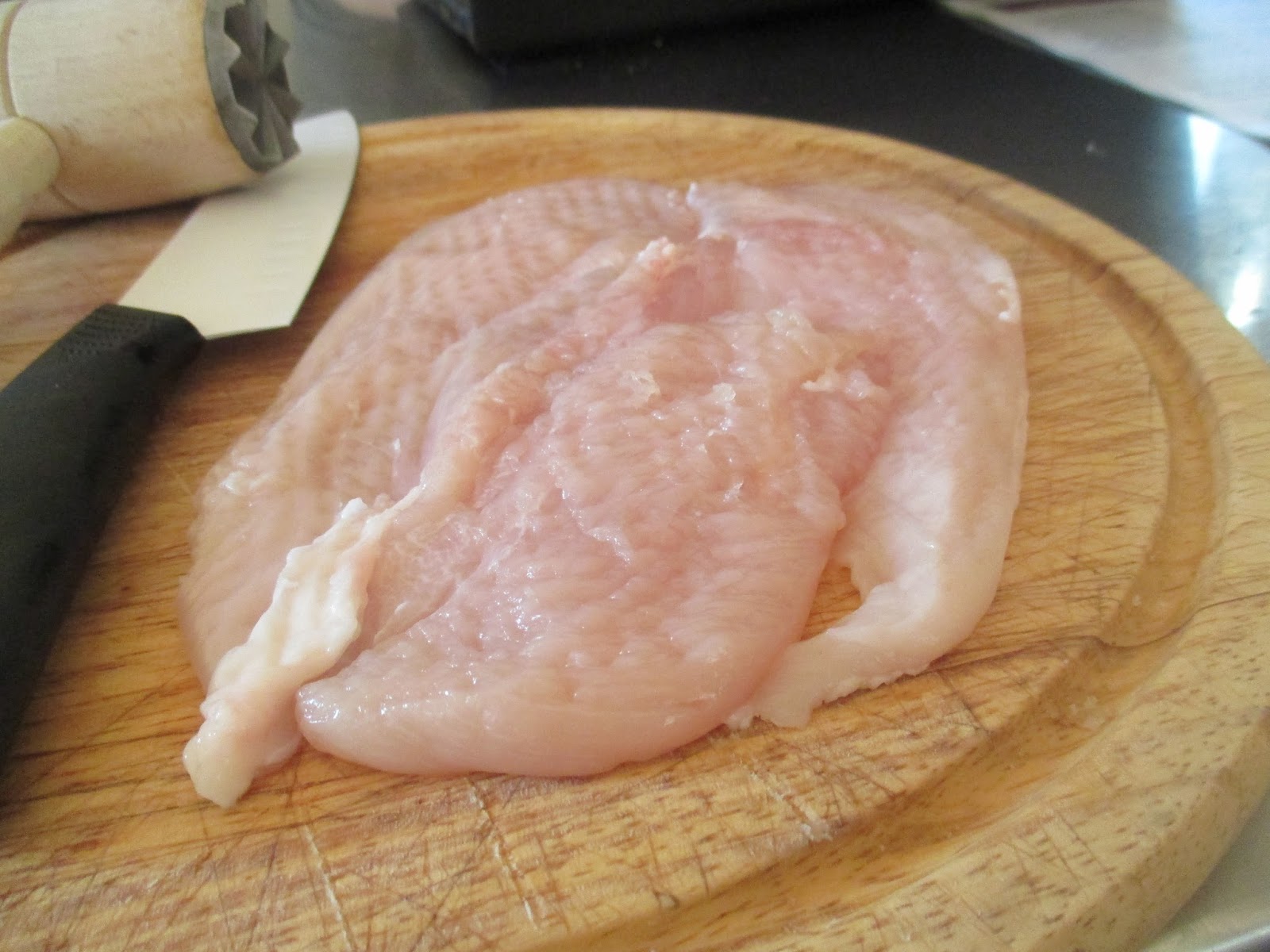 Hähnchenbrust ist ein ziemlich dickes Fleisch, bei dem sich viele Menschen bei der Zubereitung verhauen. Die meisten können nur in der Mitte roh, oder vor Angst so durchgebraten, dass man die Fleischfaser von vorne nach hinten durchziehen kann. Solche Köche, betreiben dann meistens auch noch einen florierenden Sohlen- und Absatzdienst, um Ihre tot gebratenen Spezialitäten unters Volk zu werfen, die so zäh geraten, dass sie zum menschlichen Verzehr nicht mehr geeignet sind. Jetzt schaffen wir Abhilfe. Einfach auf halber Höhe mit einem scharfen Messer ansetzen und fast bis zum anderen Ende durchschneiden. Nicht ganz durch ziehen, weil man dann zwei Hälften hätte. Ziel des Schmetterlingsschnitts ist eine möglichst große Fleischfläche in einem Stück zu haben. Also kurz bis vor das Ende schneiden und das Fleisch danach aufklappen, wie oben zu sehen.