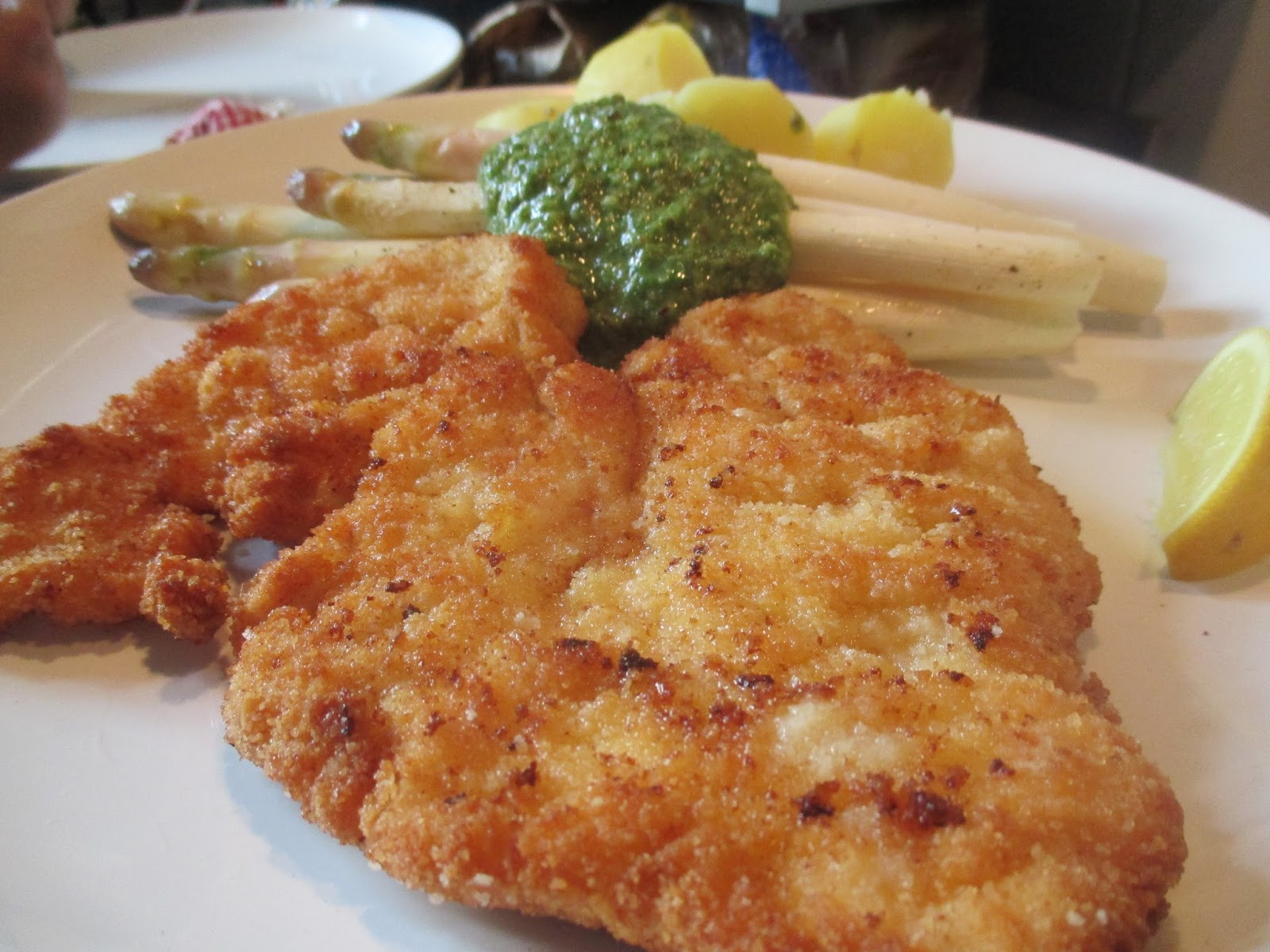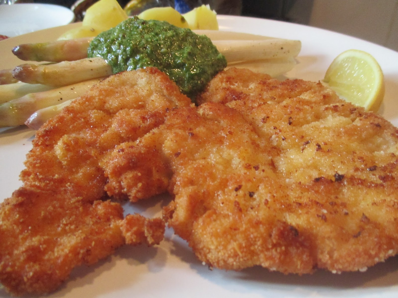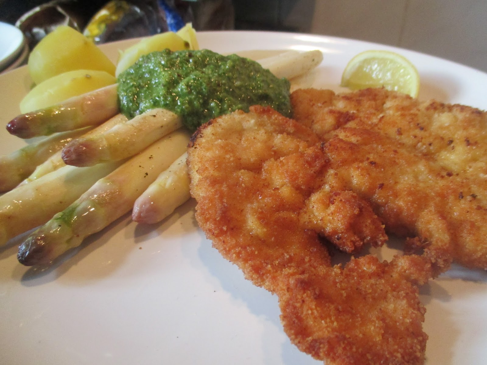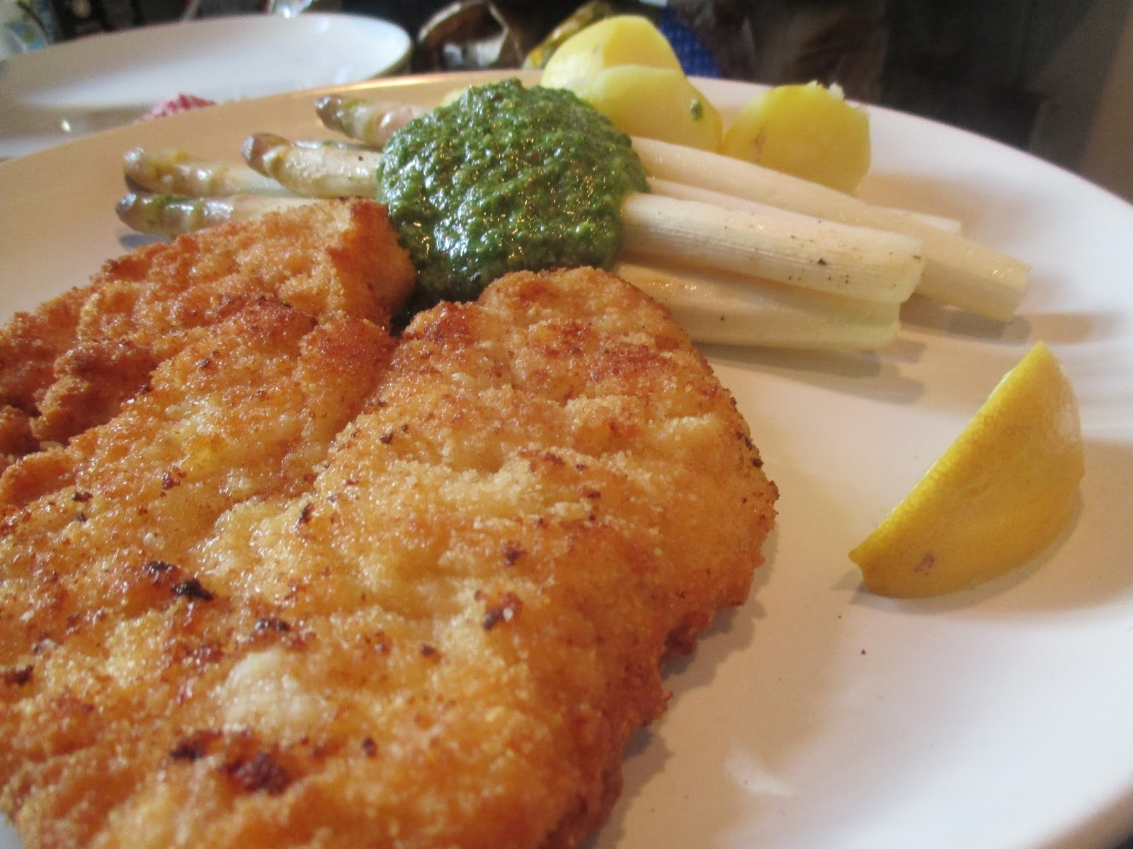 Zum Spargel gibt es dann noch Rucolapesto (Rezept anklicken) und eine Zitrone, mit der man das Schnitzel beträufeln kann, kommt auf den Teller.