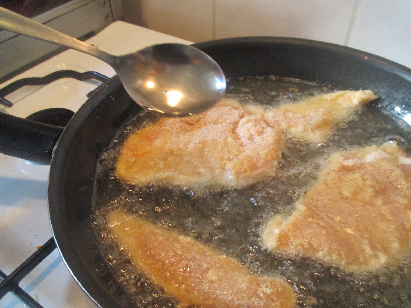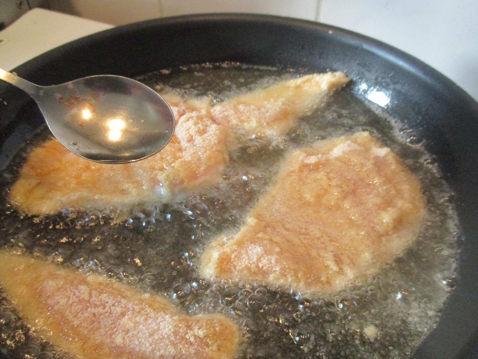 Ihr kennt Panierungen die abfallen, Fleisch das unterschiedlich dunkel gart und gerne mal schwarze Stellen nach dem Braten hat, während der andere Teil dazwischen noch viel zu hell ist? Ihr müsst jetzt ganz tapfer sein. Ihr nehmt zu wenig Temperatur und zu wenig Fett in der Pfanne und deswegen ist das Fleisch zu lange in der Pfanne, bis es durch ist, die Panierung saugt sich nur mit Fett voll, ohne dass das Fleisch knusprig wird. Also so viel Pflanzenöl in die Pfanne geben, dass das Fleisch ungefähr zur Hälfte bedeckt ist, wenn man es in die Pfanne legt. Das Schnitzel muss beim Ausbacken auf einem Ölfilm schwimmen und soll nicht den Pfannenboden berühren. Nur dann wird es wie im Restaurant und nicht nicht wie bei Mutti, die keine Ahnung vom Kochen hat und es von ihrer Mutter, die es auch nicht besser wußte, beigebracht bekommen hat. Jetzt kein Geschrei aus Österreich, gerne mal 1000 Kilometer weiter nach Norden fahren, dann wisst Ihr wovon ich spreche. Da wissen es nicht mal ausgebildete Köche, wenn man sich da die Schnitzel anschaut.