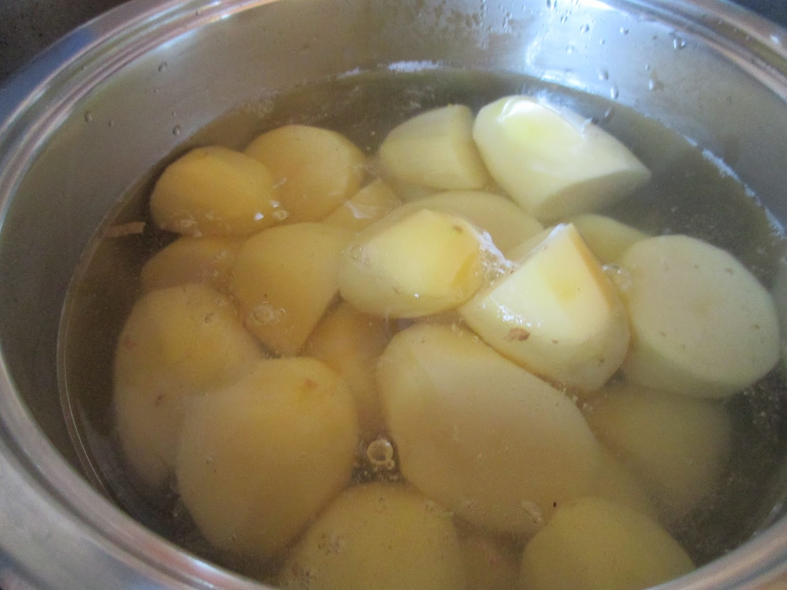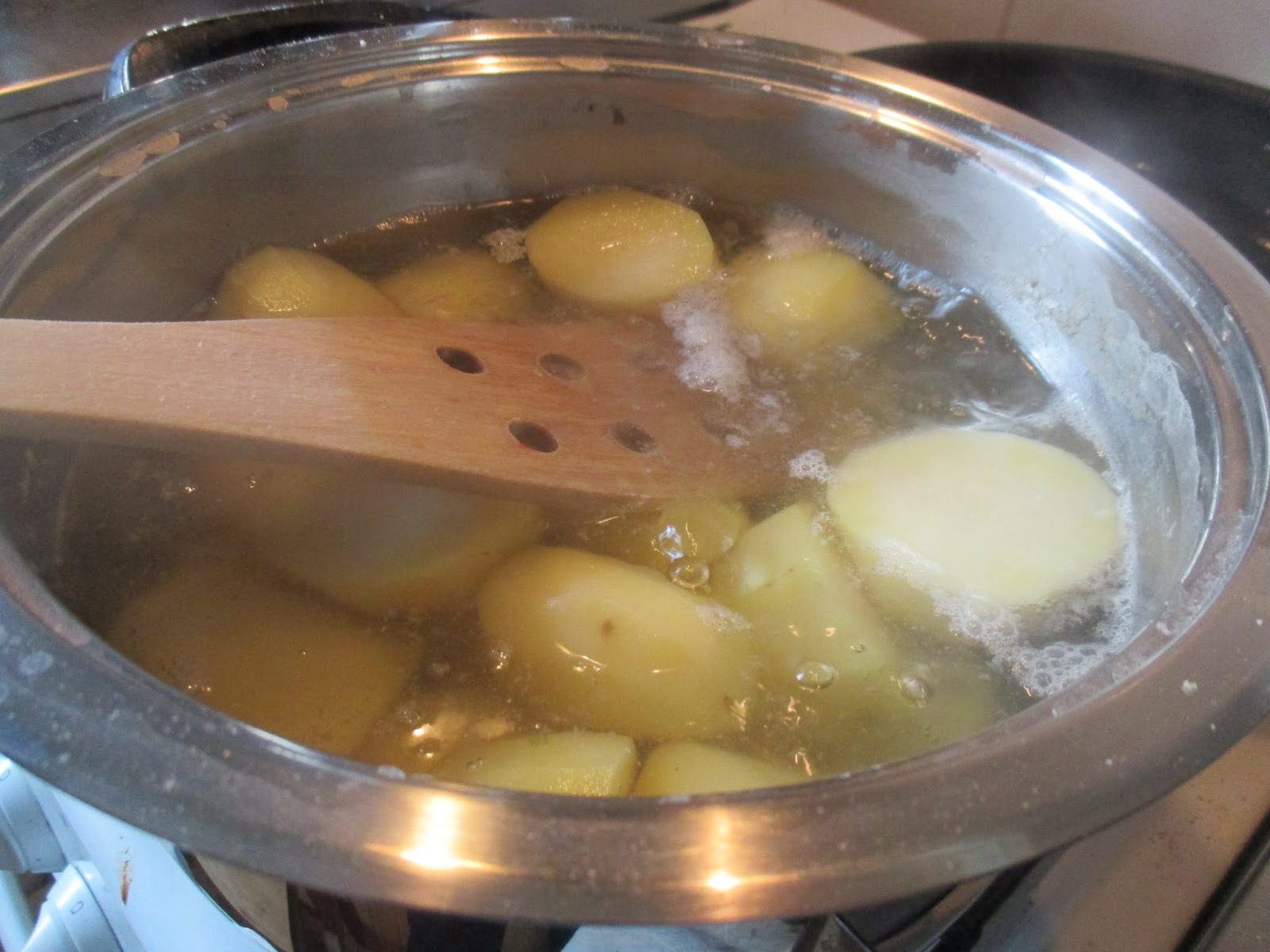 Die Zutaten, die ich zum Schnitzel serviere, brauchen alle um die zwanzig Minuten. Deswegen setzte ich schon mal die geschälten Kartoffeln auf. Wasser stark salzen. Ich habe Meersalz benutzt.