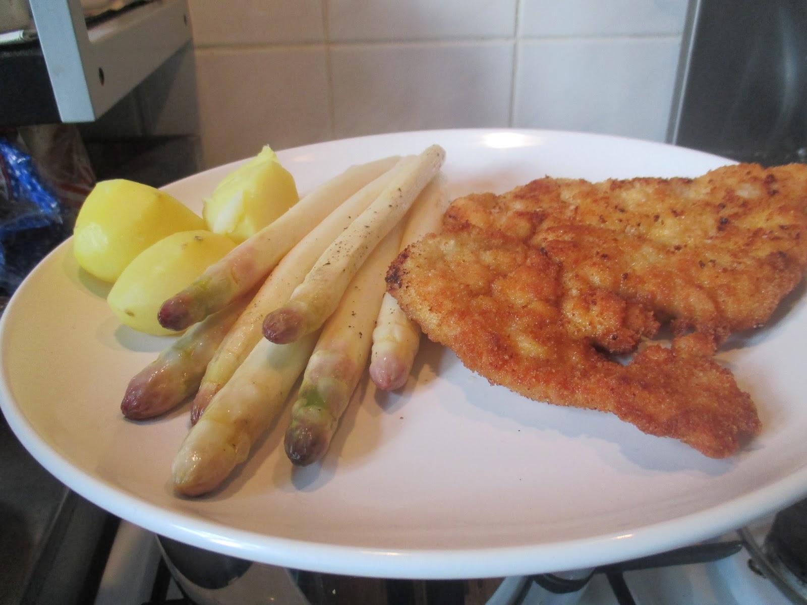 Frau und Kinder sind jedenfalls schier aus dem Häuschen, bei dem zarten Fleisch, unter der knackigen Panierung. Der innovativ gegarte Ofenspargel mit Butter, kann geschmacklich auch viel mehr, als die arme in Wasser gegarte Verwandtschaft.