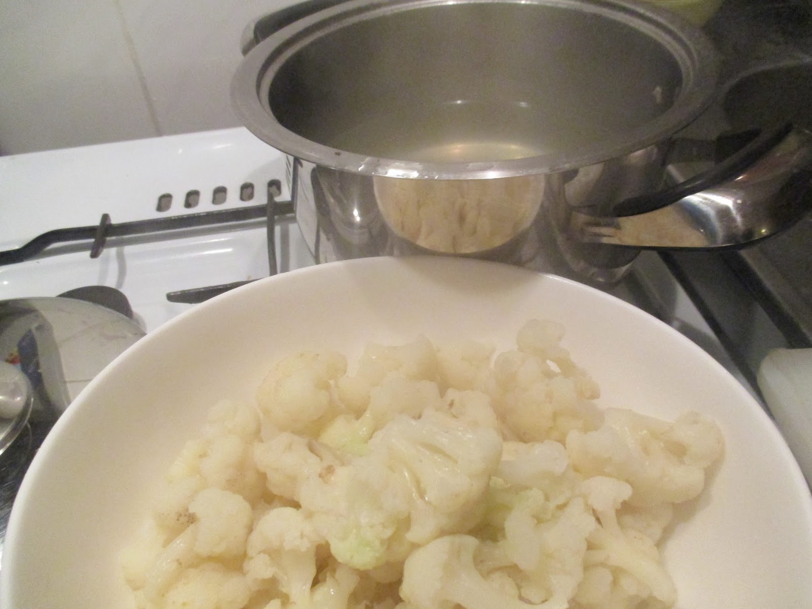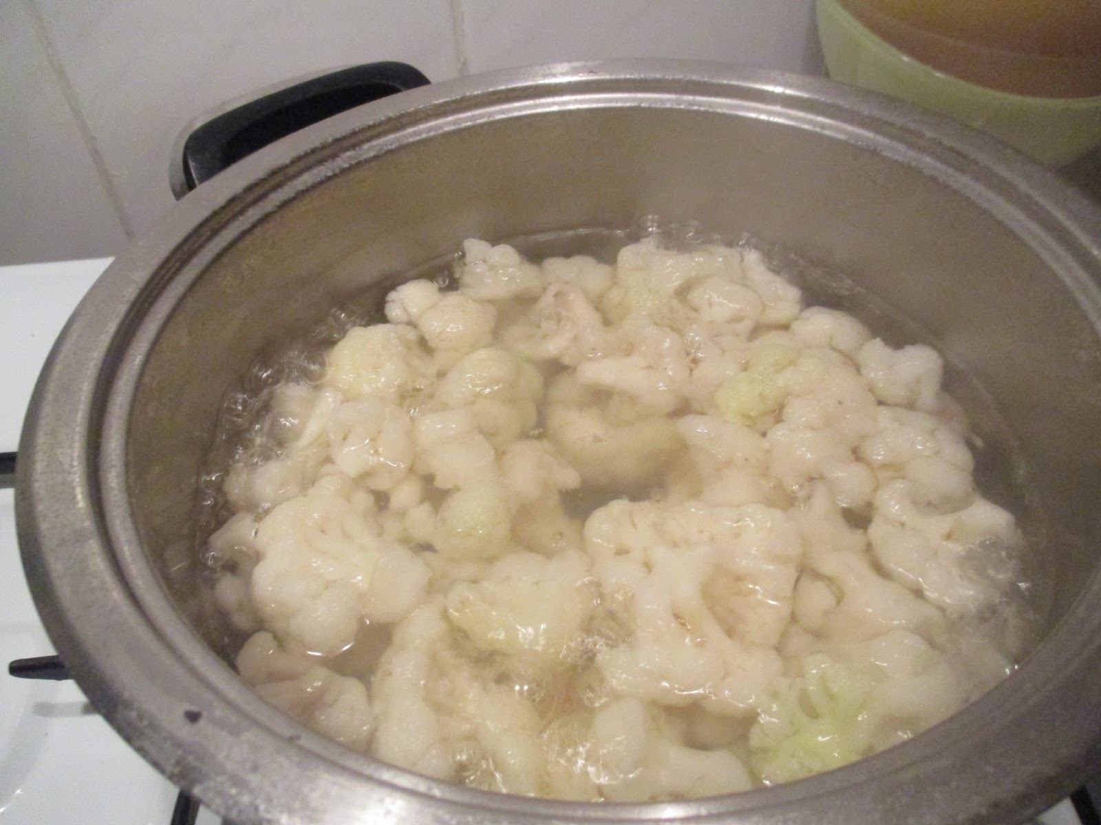 Wenn das Wasser kocht, den Blumenkohl für 8 Minuten ins kochende Wasser geben.