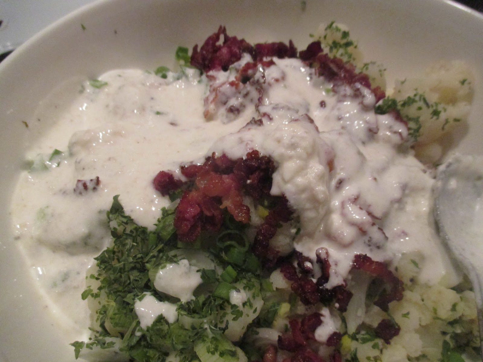Mir schmeckt das sehr gut. Das nicht total tot gekochte Gemüse, macht mit dem knackigen Salat ein gutes Mundgefühl und das saure Sahne Dressing, ist sehr rund mit den Lauchzwiebeln und dem Bacon.