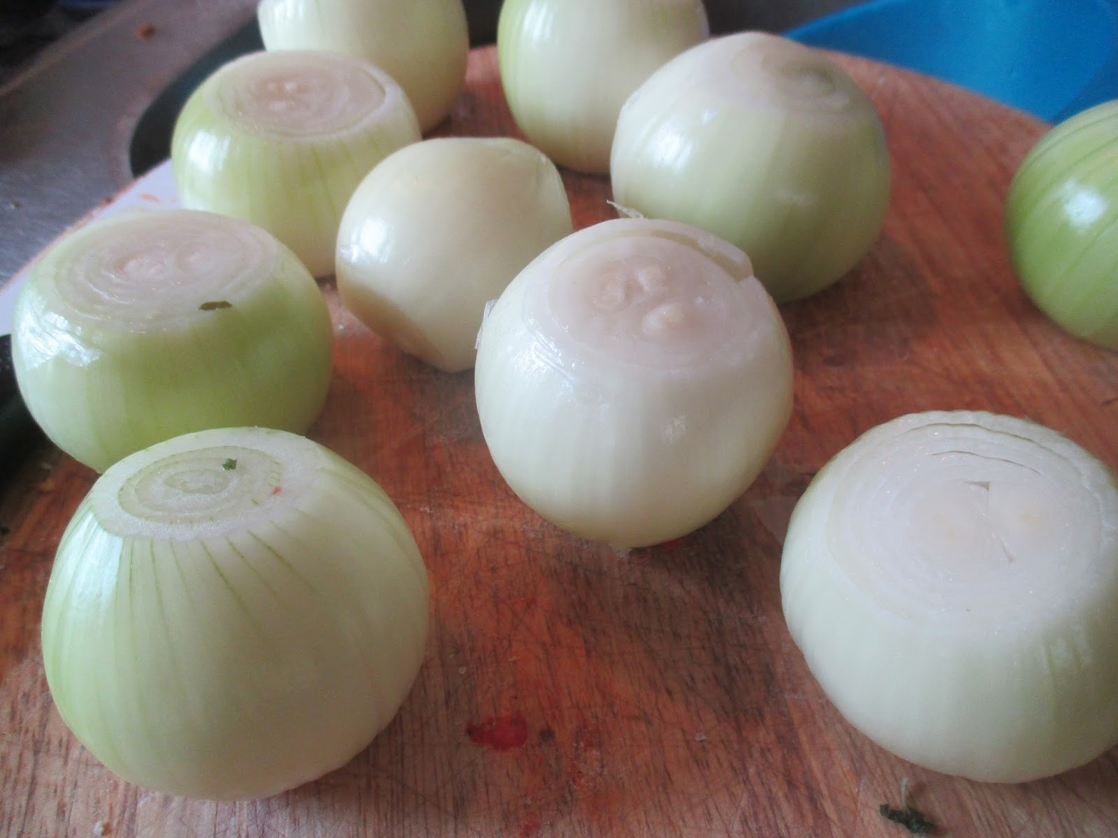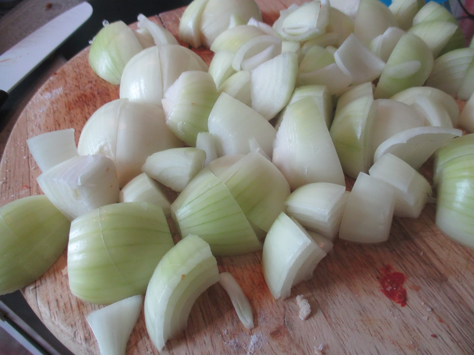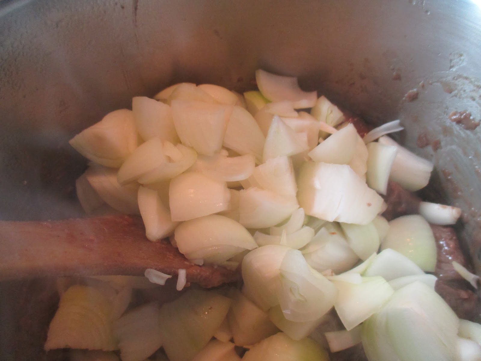 Während das Fleisch anbrät, bereite ich schon die Zwiebeln vor.