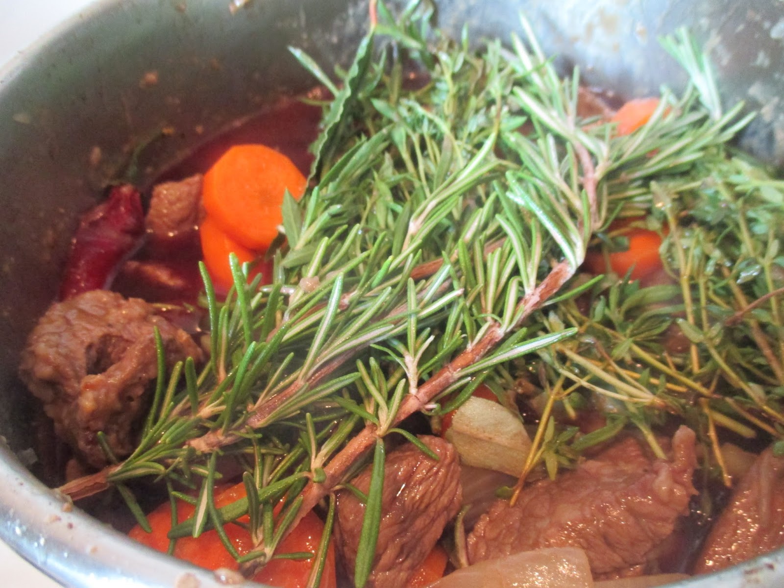 Nun den Deckel auf den Topf legen und langsam aufkochen. Wenn es leicht sprudelt, auf die kleinste Herdplatte umziehen und aufpassen, dass es immer nur ganz leicht simmert. Wichtig ist, den Deckel auf den Topf zu legen, damit das Fleisch zart wird und ganz niedrige Temperatur halten. Je länger Ihr schmort, desto besser wird das Gericht. Unter 4 Stunden würde ich gar nicht erst anfangen. Ich habe beim Zubereiten 4 Stunden schmoren lassen und es dann am nächsten Tag bei kleiner Hitze noch einmal 2 Stunden aufgewärmt, bis die Fleischfaser wieder ganz weich war.