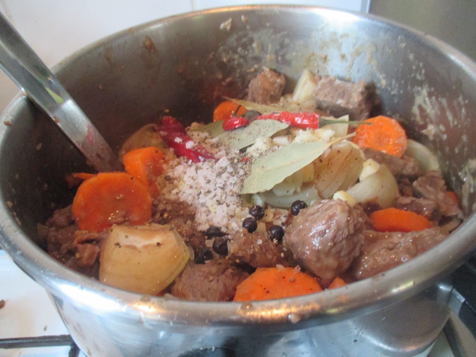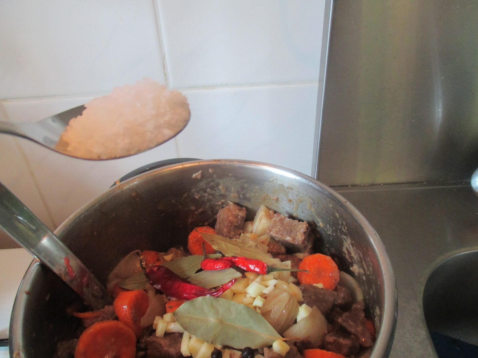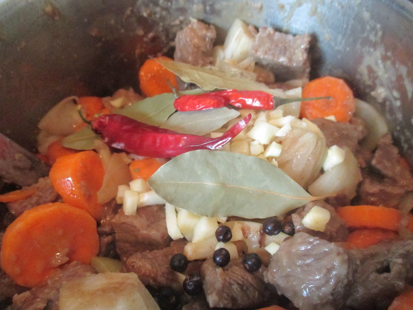 Für den guten Geschmack kommen jetzt noch Lorbeerblätter und Wacholderbeeren in den Topf. Das gehört bei einem klassischen Schmorgericht zum guten Ton. Damit man später auch irgendwas schmeckt habe ich noch drei Peperoni dazu gelegt.