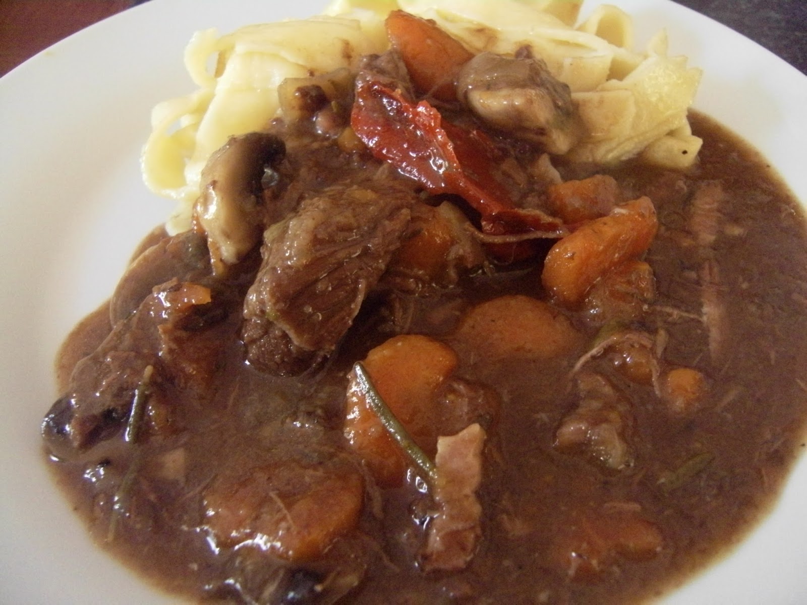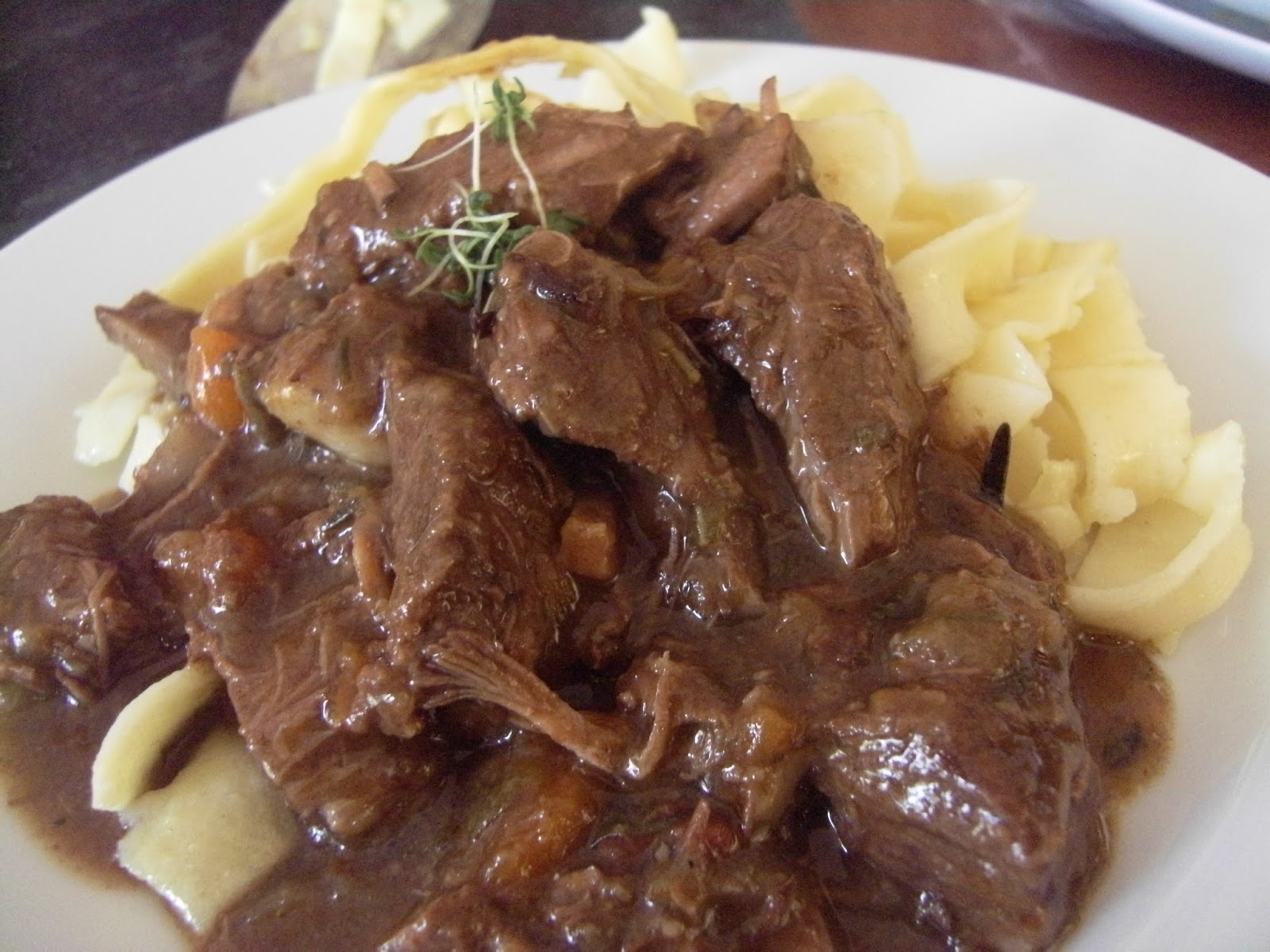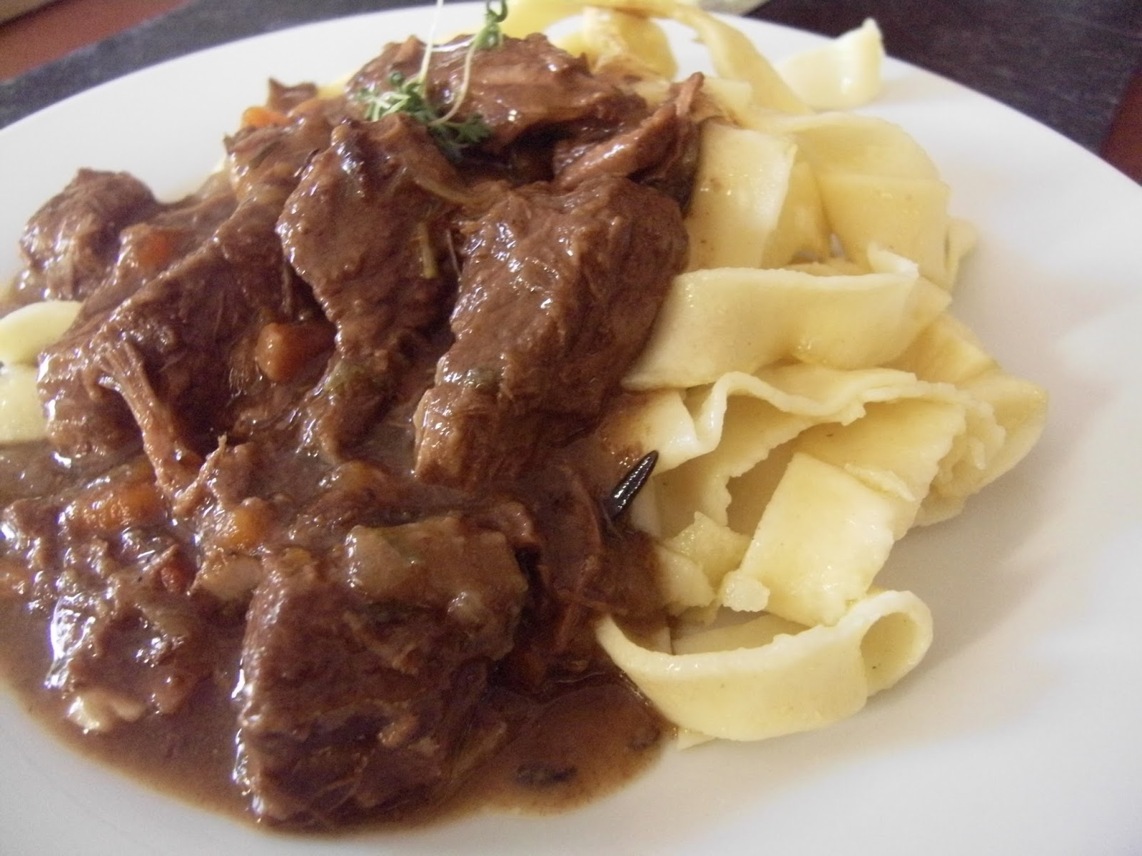 Das ist extrem feines Fleisch, durch die lange Schmorzeit. Das Gemüse, die Kräuter, der Wein und die Gewürze, geben einen runden und vollen Geschmack. Ich mag solche Begriffe nicht, wie Geschmacksexplosion und was manche Leute dann so daher salbadern, aber falls irgendwer vor dem Rechner sitzt, der diesen Begriff verwendet, dann weiß er/sie jetzt, was im Mund passiert, wenn man so ein Essen auf dem Teller hat. Das schmeckt total rein, weil von außen nichts hinzugefügt wurde, was den Geschmack dämpft, wie die meisten Bindemittel, wie Speisestärke. Das schmeckt so, wie es eingekocht wurde, aus lauter frischen Zutaten. Ich empfinde das als echtes Erlebnis, angesichts des ganzen Mists, den man immer mal wieder vorgesetzt bekommt, bei dem jede Liebe und auch der Faktor Zeit fehlt, damit etwas daraus werden kann.