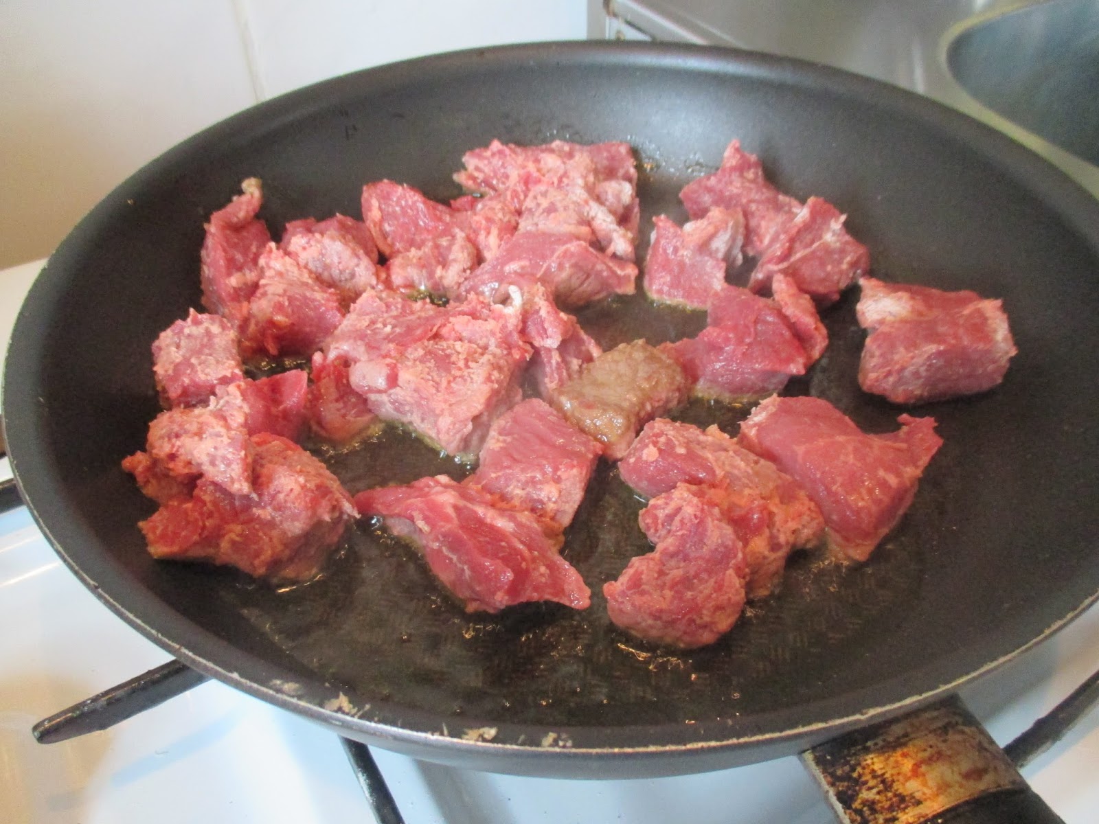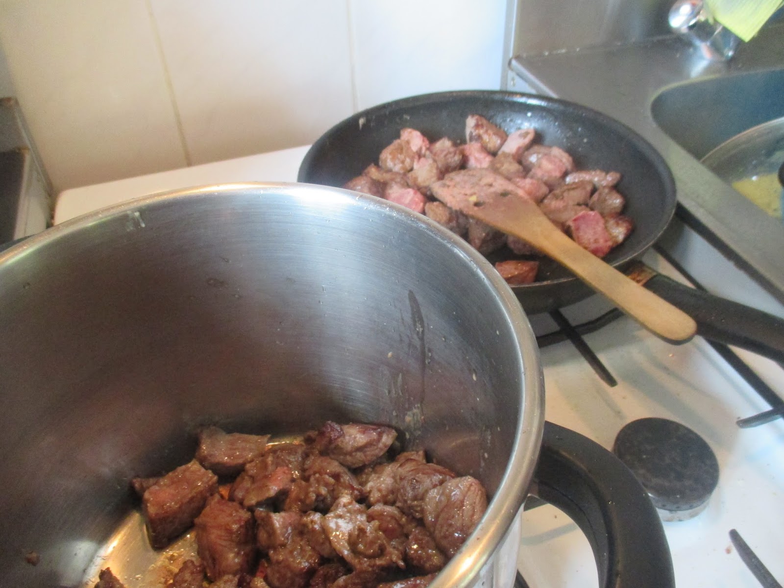 Hier kann man das ganz gut sehen. Das erste angebratene Fleisch ist schon im Schmortopf, während in der Pfanne die nächste Lage angebraten wird. Der Schmortopf ist auf mittlere Hitze eingestellt.